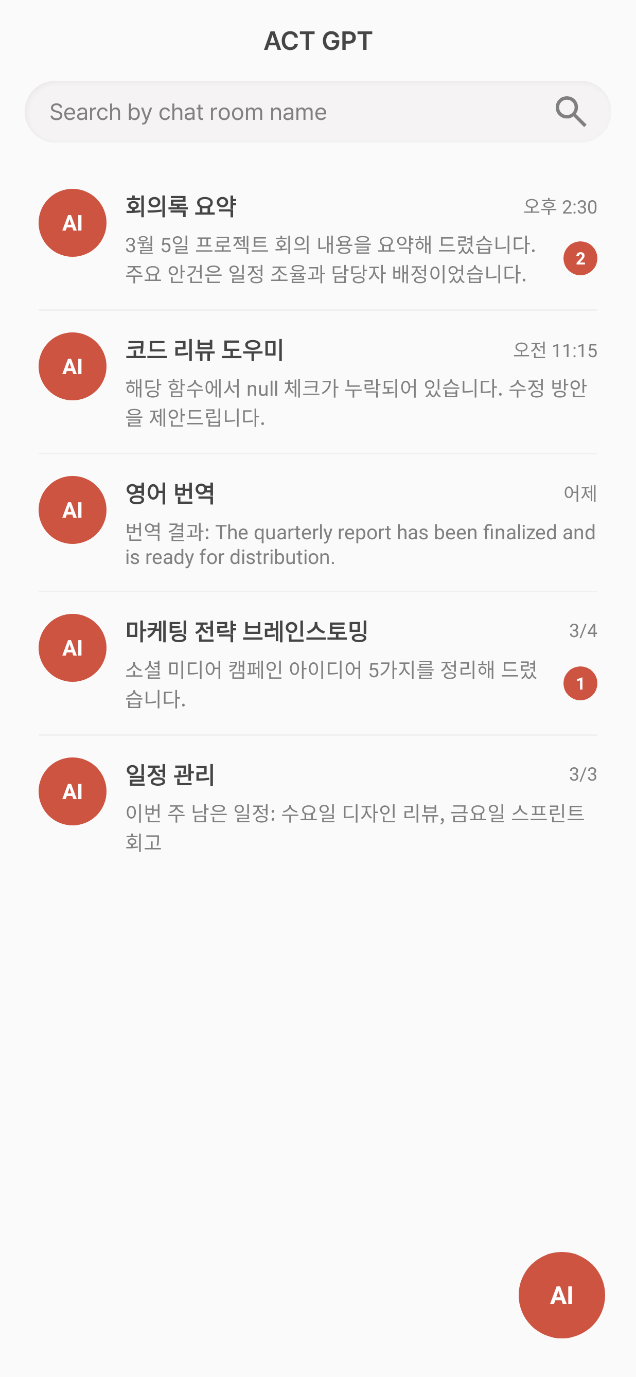 자료실, 대화내용, 생성된 결과물 등을 AI 대화방(ACT GPT)을 통해서 검색하고 질의할 수 있습니다. 회의록 요약, 코드 리뷰 도우미, 영어 번역, 마케팅 전략 브레인스토밍, 일정 관리 등 목적별 AI 대화방을 만들어 활용할 수 있습니다.