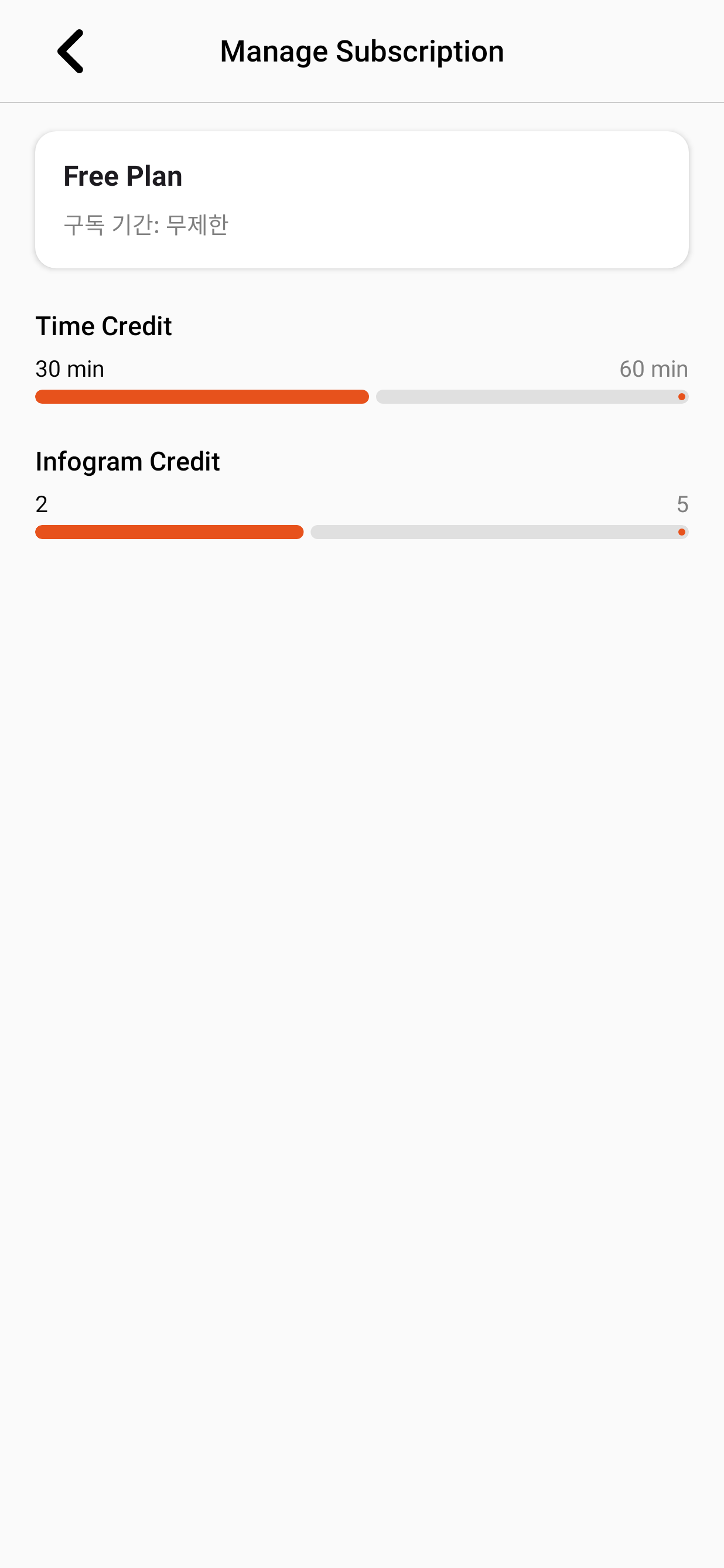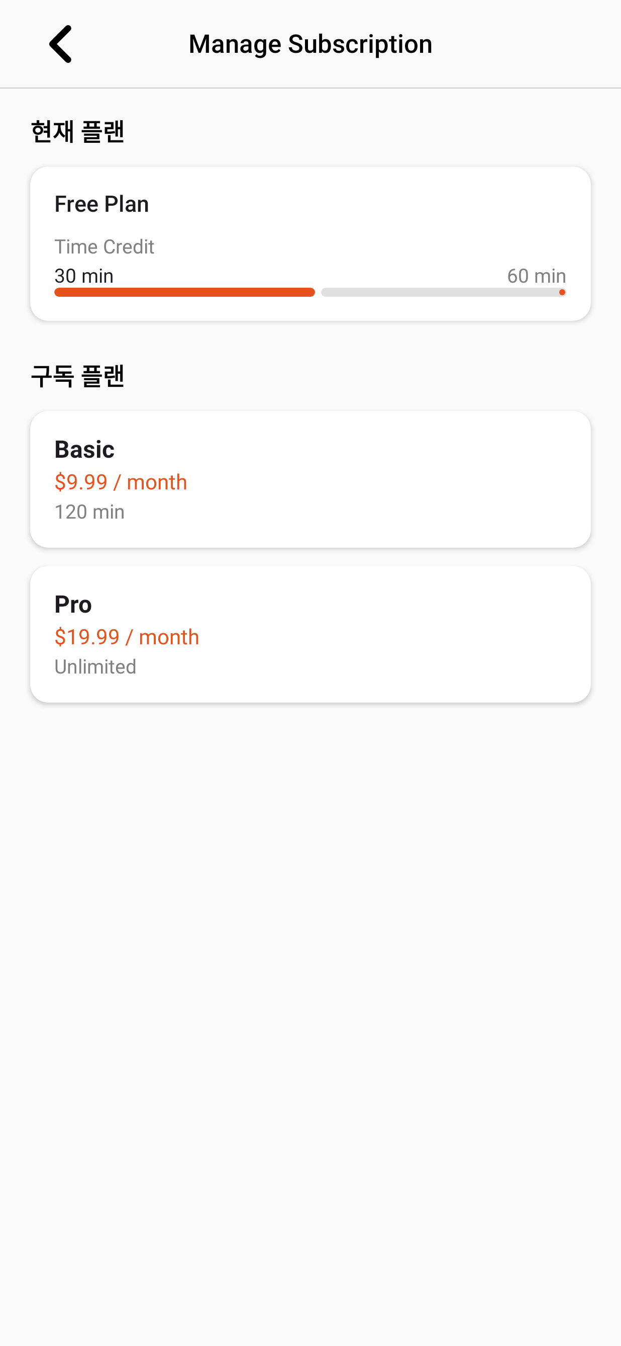 Google Play Billing을 연동한 인앱 구독 시스템을 구현했습니다. 무료 플랜부터 Basic, Pro 플랜까지 단계별 서비스를 제공하며, 녹음 시간 크레딧과 인포그램 크레딧을 관리합니다.