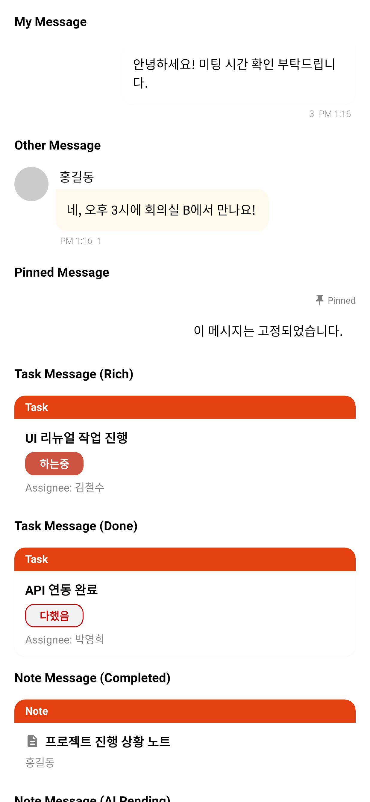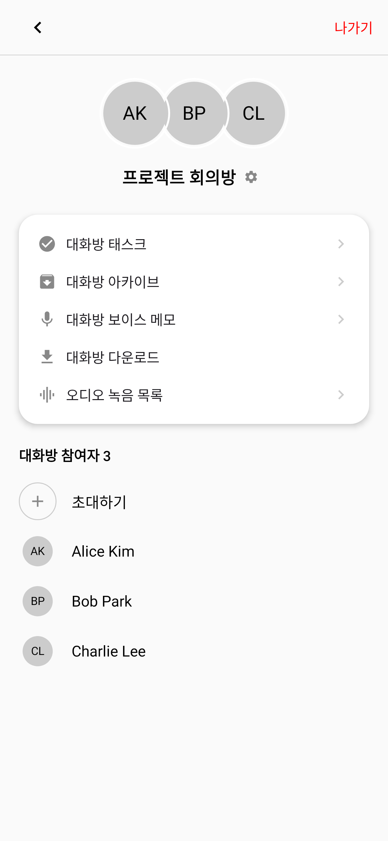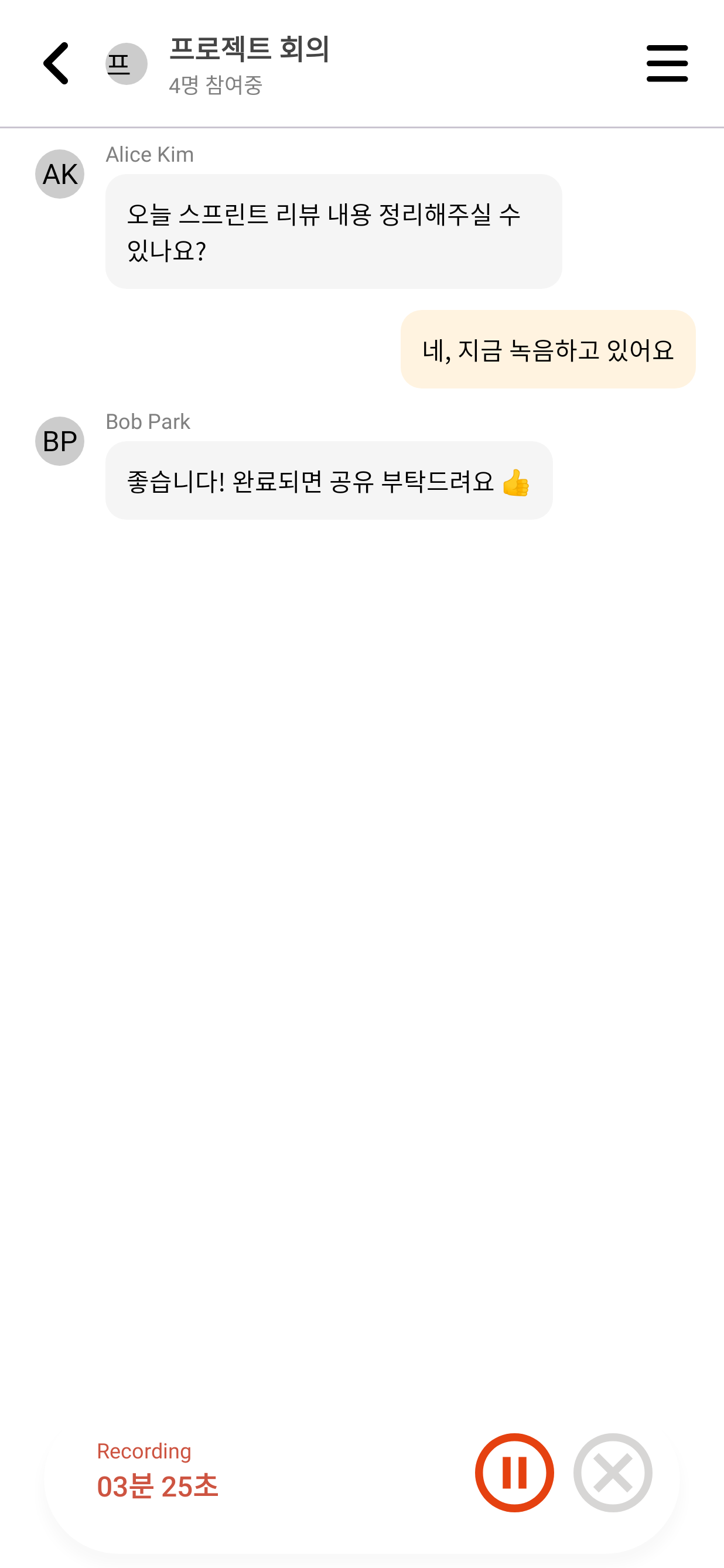 대화방에서 바로 할일(Task)을 생성하거나, 노트를 공유하거나, 보이스 메모를 녹음할 수 있어 채팅과 업무가 자연스럽게 연결됩니다.