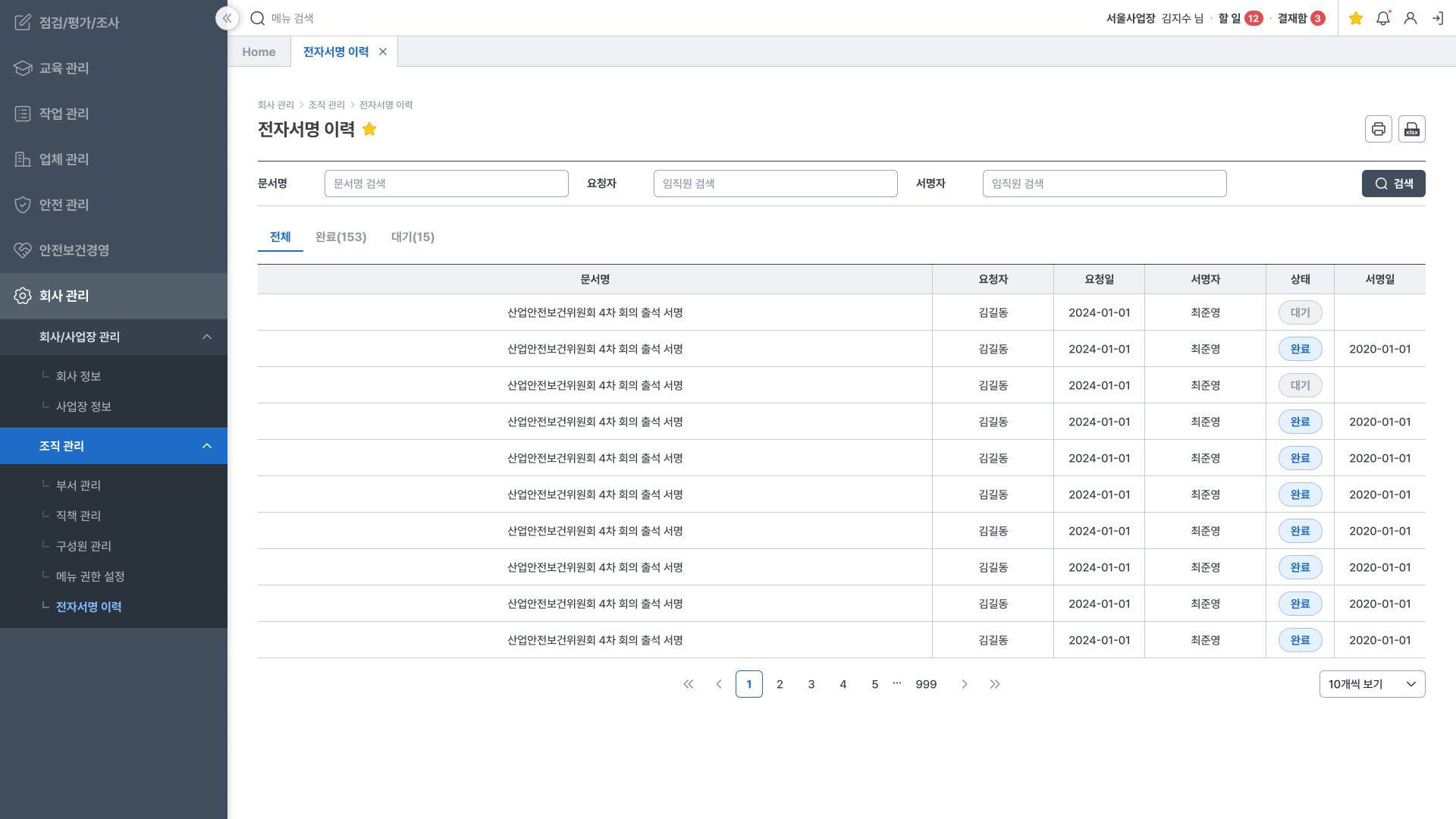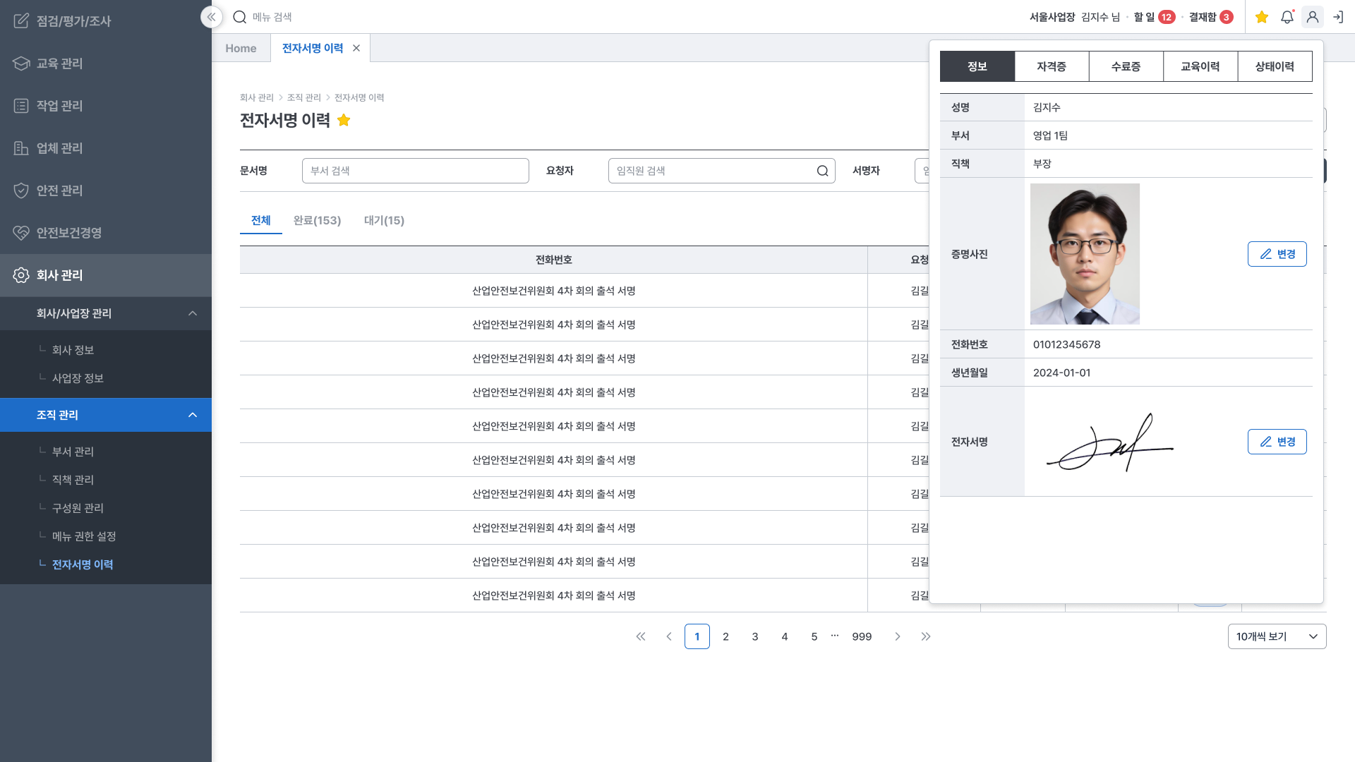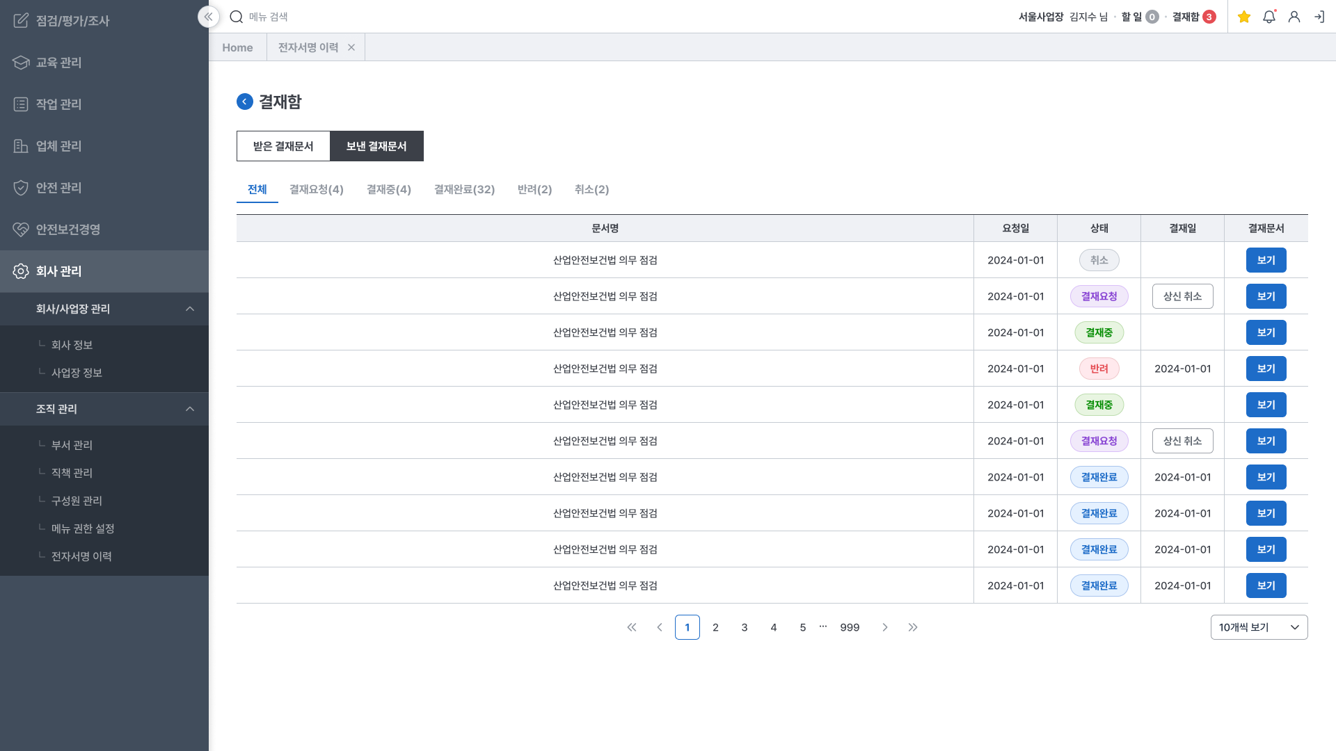 안전보건 업무의 승인 워크플로우를 전자결재로 처리합니다. 결재요청 → 결재중 → 결재완료/반려/취소의 상태 흐름을 시스템이 자동 관리하며, 받은 결재문서와 보낸 결재문서를 분리하여 조회할 수 있습니다. 전자서명 이력에서 서명한 문서의 이력을 추적하고, 개인 프로필에서 자필 전자서명을 등록할 수 있습니다.