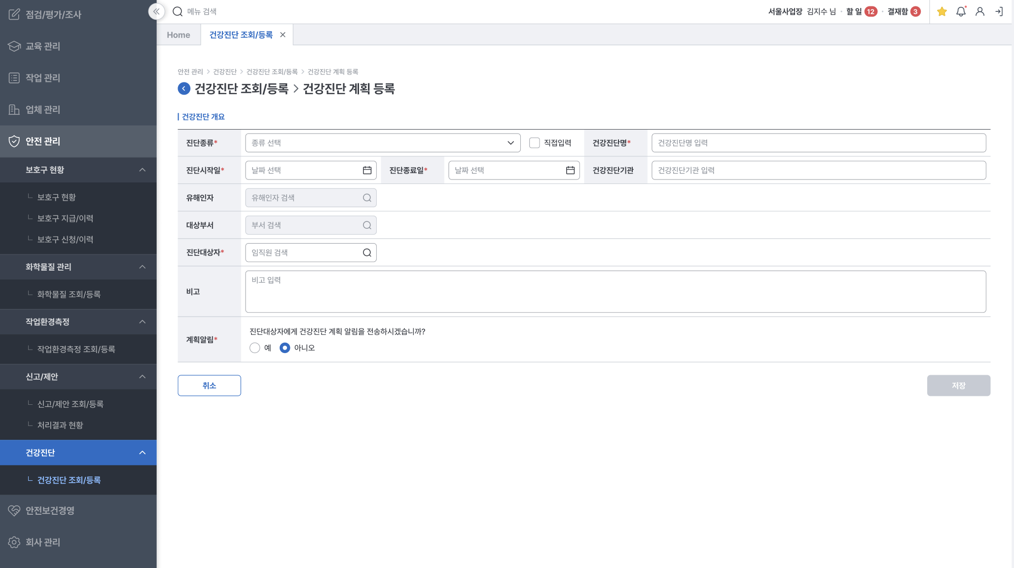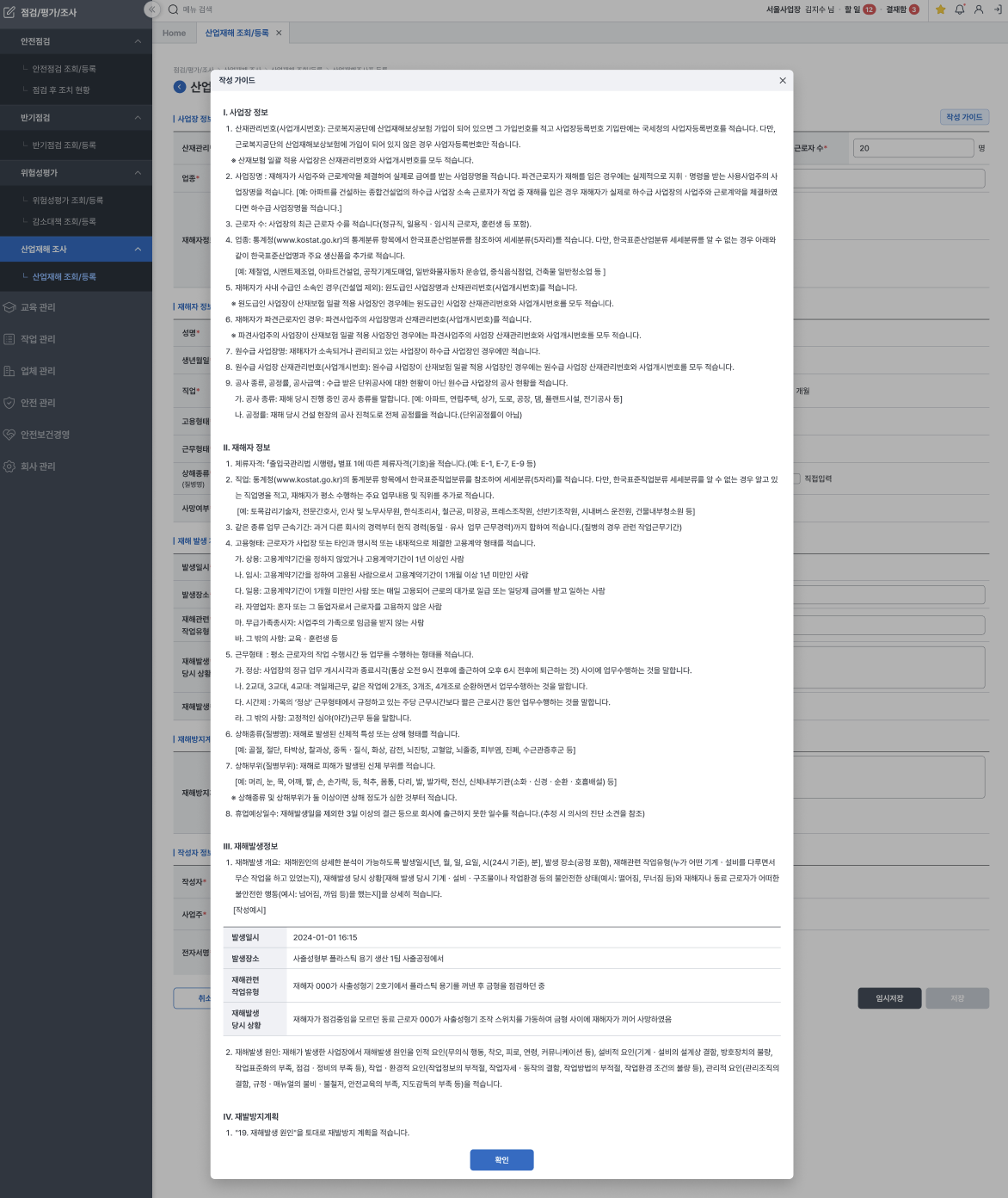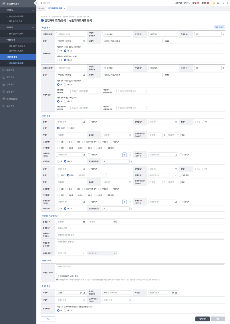 건강진단 조회/등록에서 근로자의 일반·특수·배치 전 건강진단 일정과 결과를 관리합니다. 진단 현황에서 판정 결과(A·C·D1·D2·R1·R2)를 기록하고, 사후조치 이력을 추적합니다. 산업재해 조회/등록에서는 재해 발생 시 사고 경위, 상해 부위, 재해 유형 등 법정 기록 사항을 체계적으로 등록하며, 등록 가이드가 산업재해 신고 절차를 안내합니다.