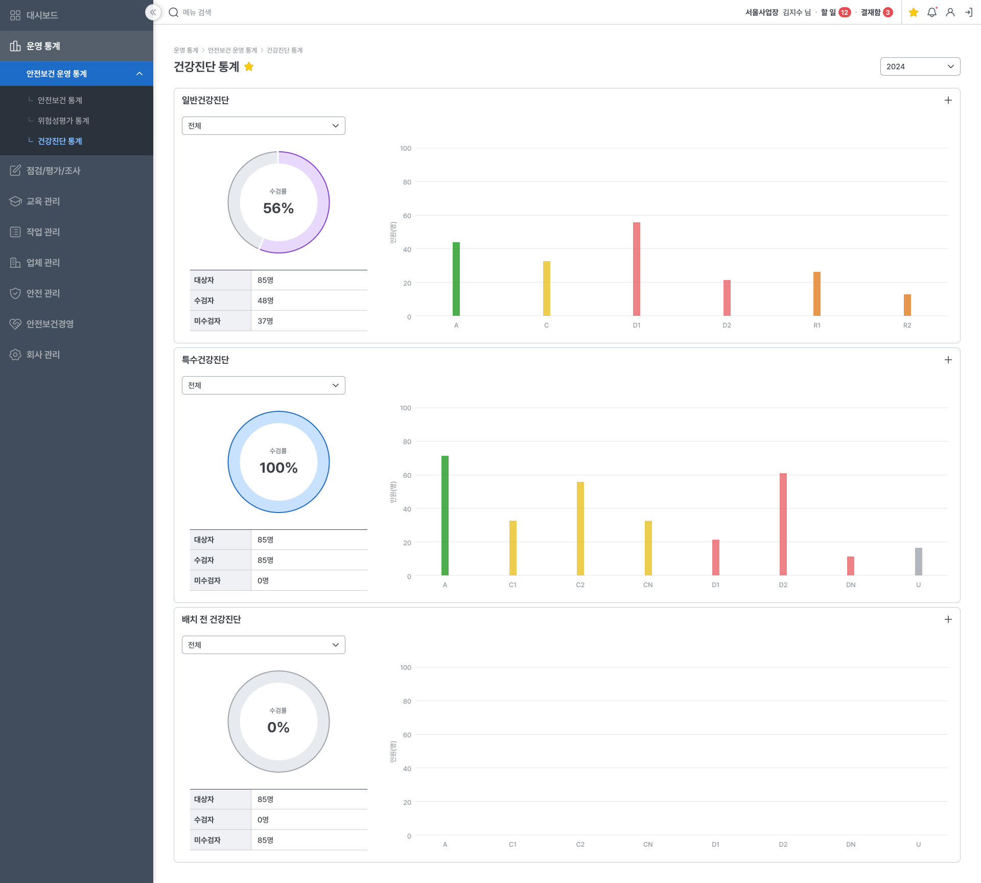 ECharts 기반의 인터랙티브 통계 대시보드로 안전보건 운영 현황을 실시간 시각화합니다. 안전보건 통계에서는 예산 집행률, 목표 달성률, 위원회 이행률, 교육 이수율, 안전점검·산업재해·신고/제안 현황을 도넛·바·게이지 차트로 표시합니다. 위험성평가 통계에서는 평가 진행 현황, 감소대책 처리율, 유해위험요인 분포(기계·작업특성·작업환경·화학·생물학·전기·특수작업), 위험도 개선 전후 비교를 제공합니다. 건강진단 통계에서는 일반건강진단·특수건강진단·배치 전 건강진단의 수검률과 판정 결과 분포를 한눈에 파악할 수 있습니다.