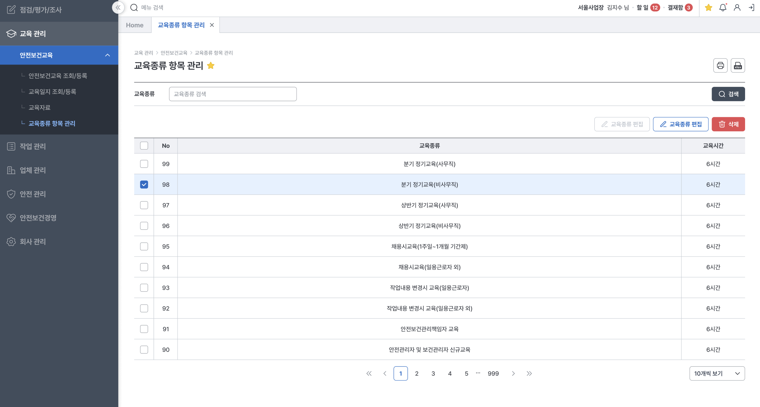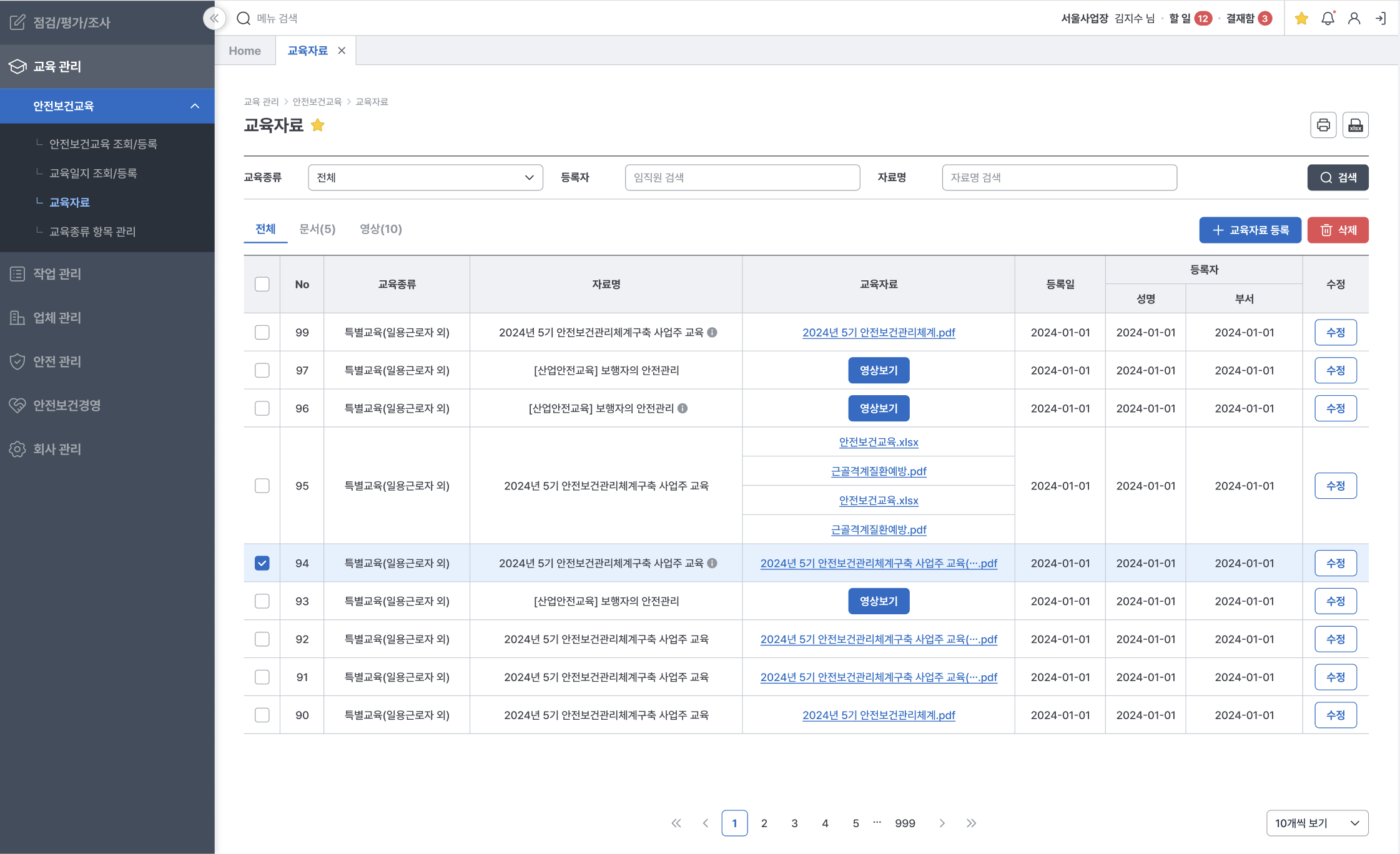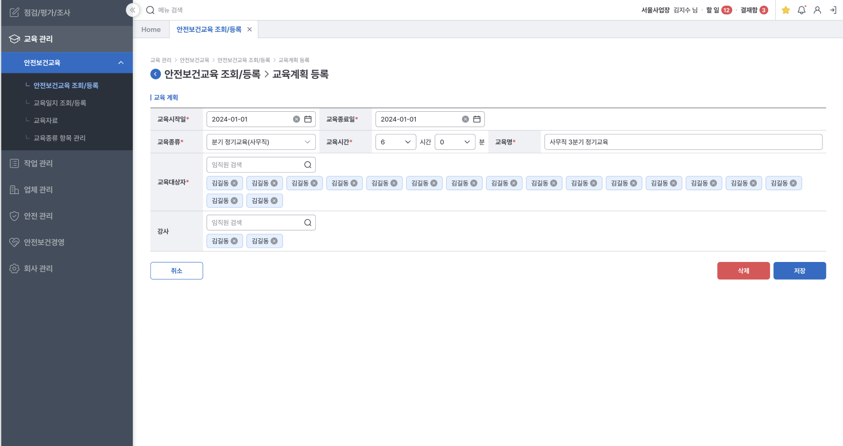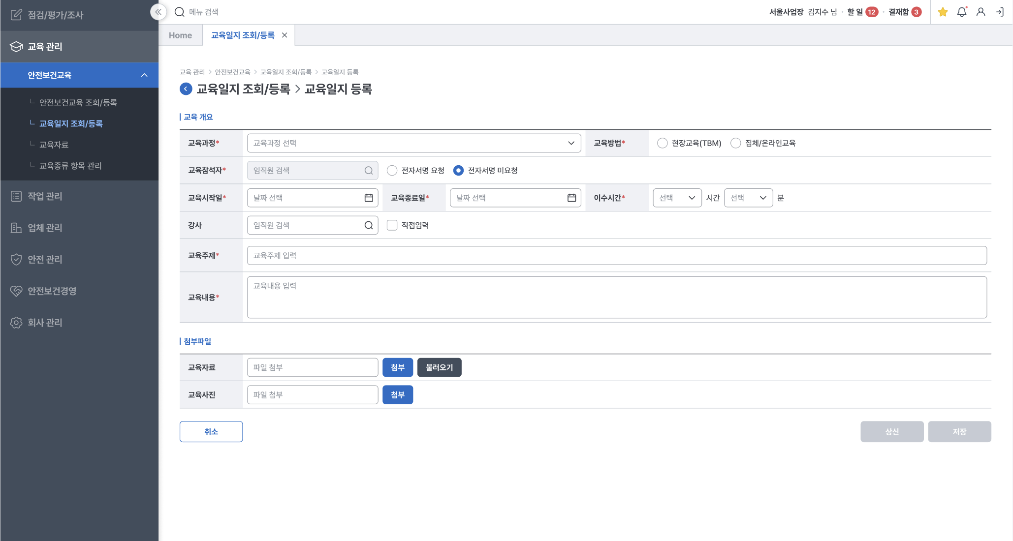 안전보건 교육계획 수립, 교육일지 작성, 교육자료 관리, 교육종류 항목 설정을 통합 관리합니다. 교육일지 등록 시 교육방법(현장교육/TBM/집체/온라인) 선택, 전자서명 요청, 교육사진·자료 첨부가 가능하며, 교육 이수 현황은 통계 대시보드에서 월별·부서별 이수율로 자동 집계됩니다.