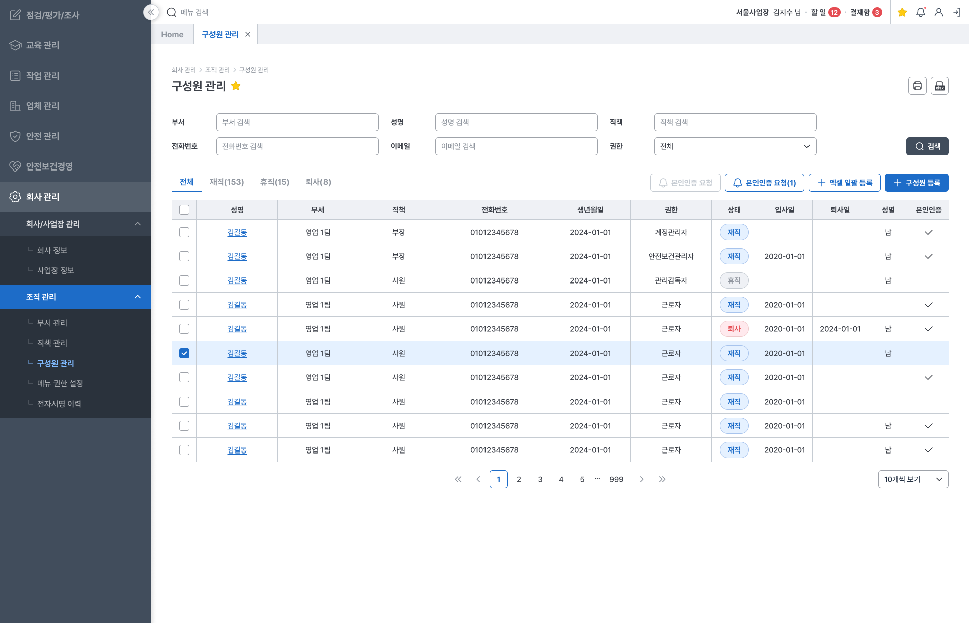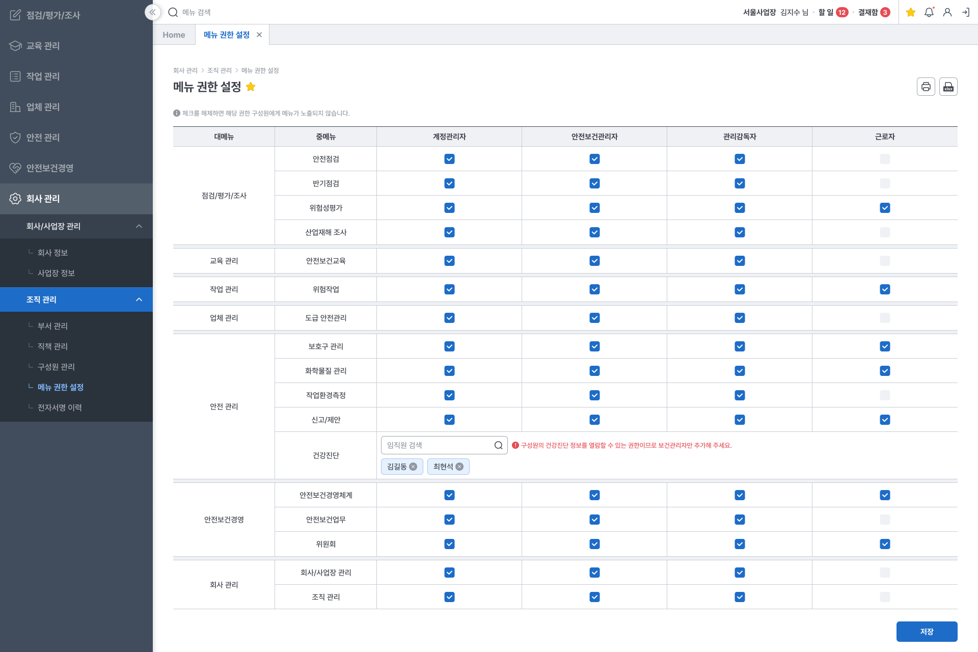 회사/사업장 정보, 부서·직책 관리, 구성원 관리, 메뉴 권한 설정을 통합 관리합니다. 메뉴 권한 설정에서는 역할별(계정관리자·안전보건관리자·관리감독자·근로자)로 접근 가능한 메뉴를 체크박스 매트릭스로 세밀하게 제어합니다. 개인 프로필에서 교육이력, 상태이력, 자격증, 수료증, 전자서명을 관리합니다.