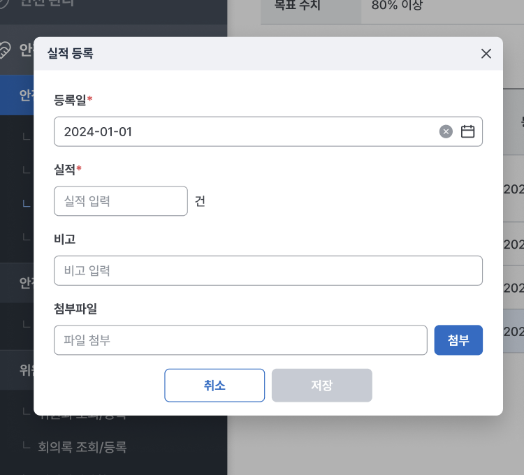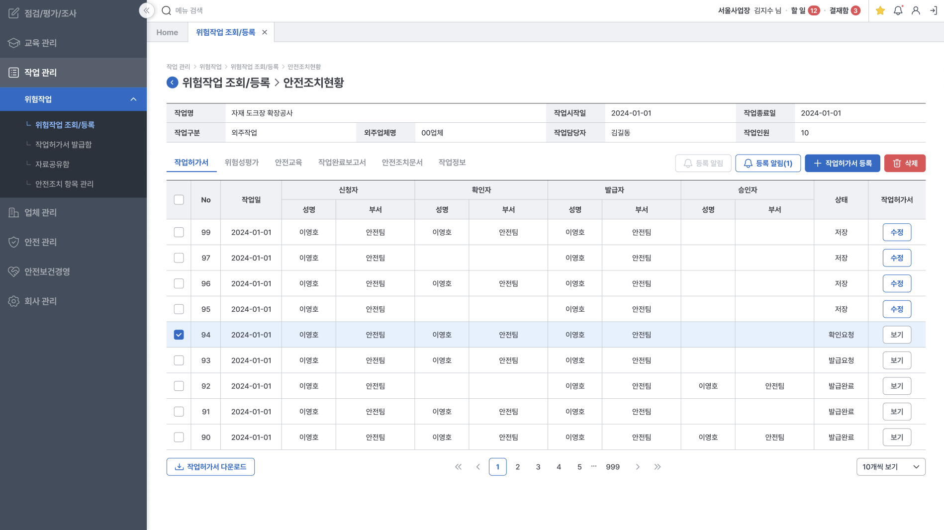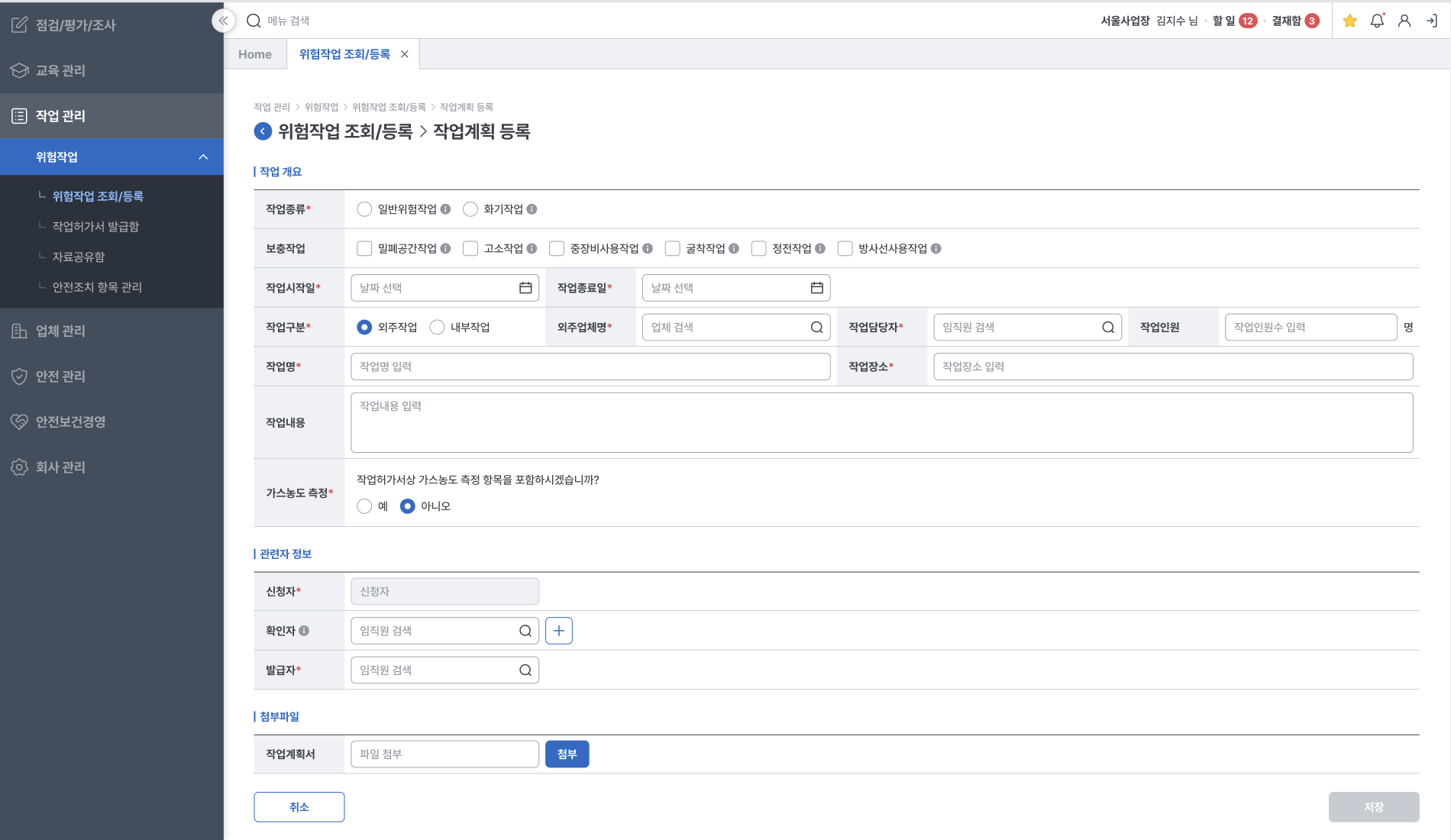 산업안전보건법 제38조에 따른 유해·위험 작업의 허가, 안전조치 현황을 관리합니다. 위험작업 등록 시 작업 유형·장소·기간·안전조치 항목을 기록하고, 안전조치 이행 현황을 목록에서 추적합니다. 안전조치 항목관리에서 사업장별 안전조치 항목을 사전 정의하여 일관된 관리가 가능합니다.