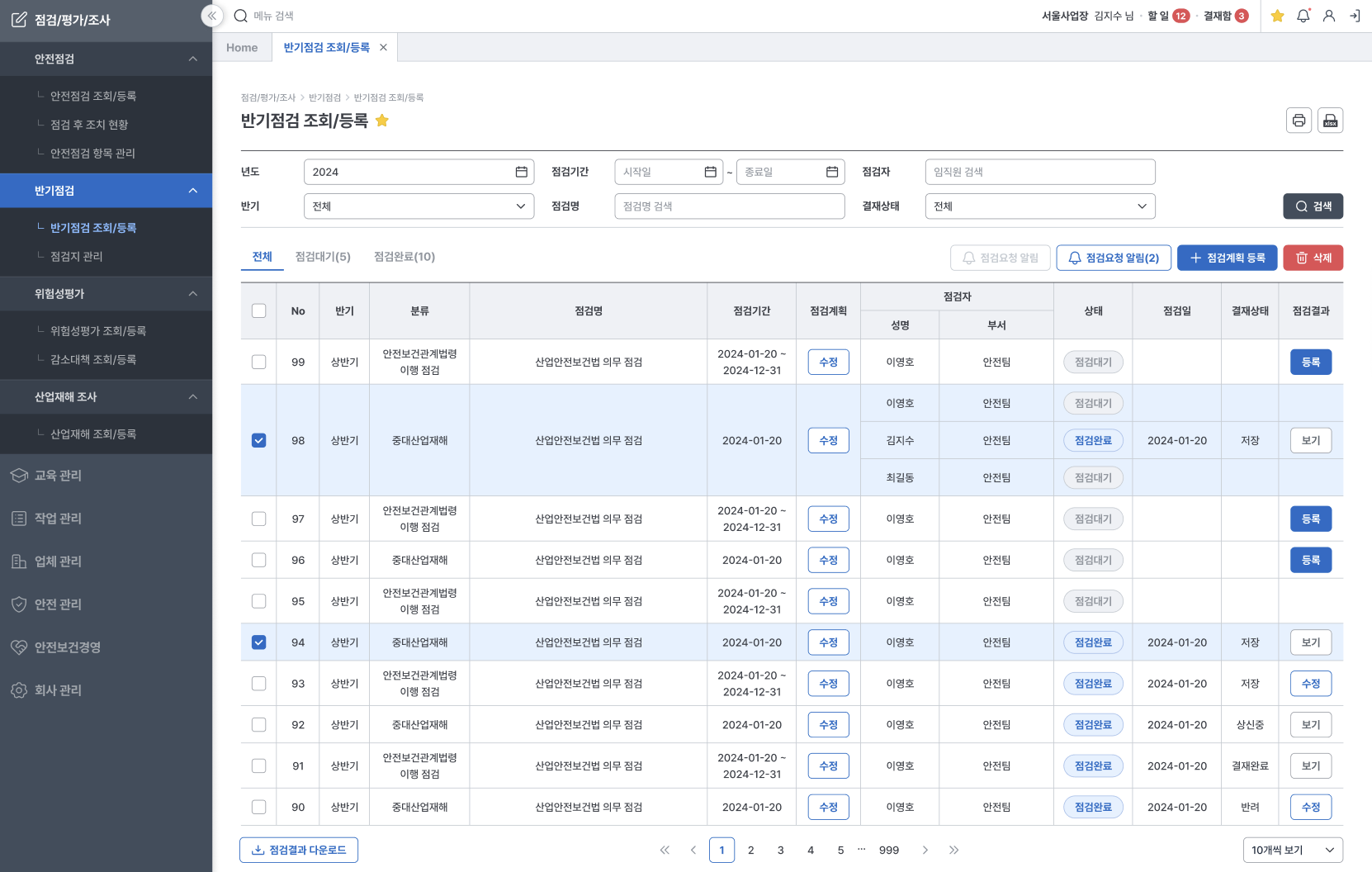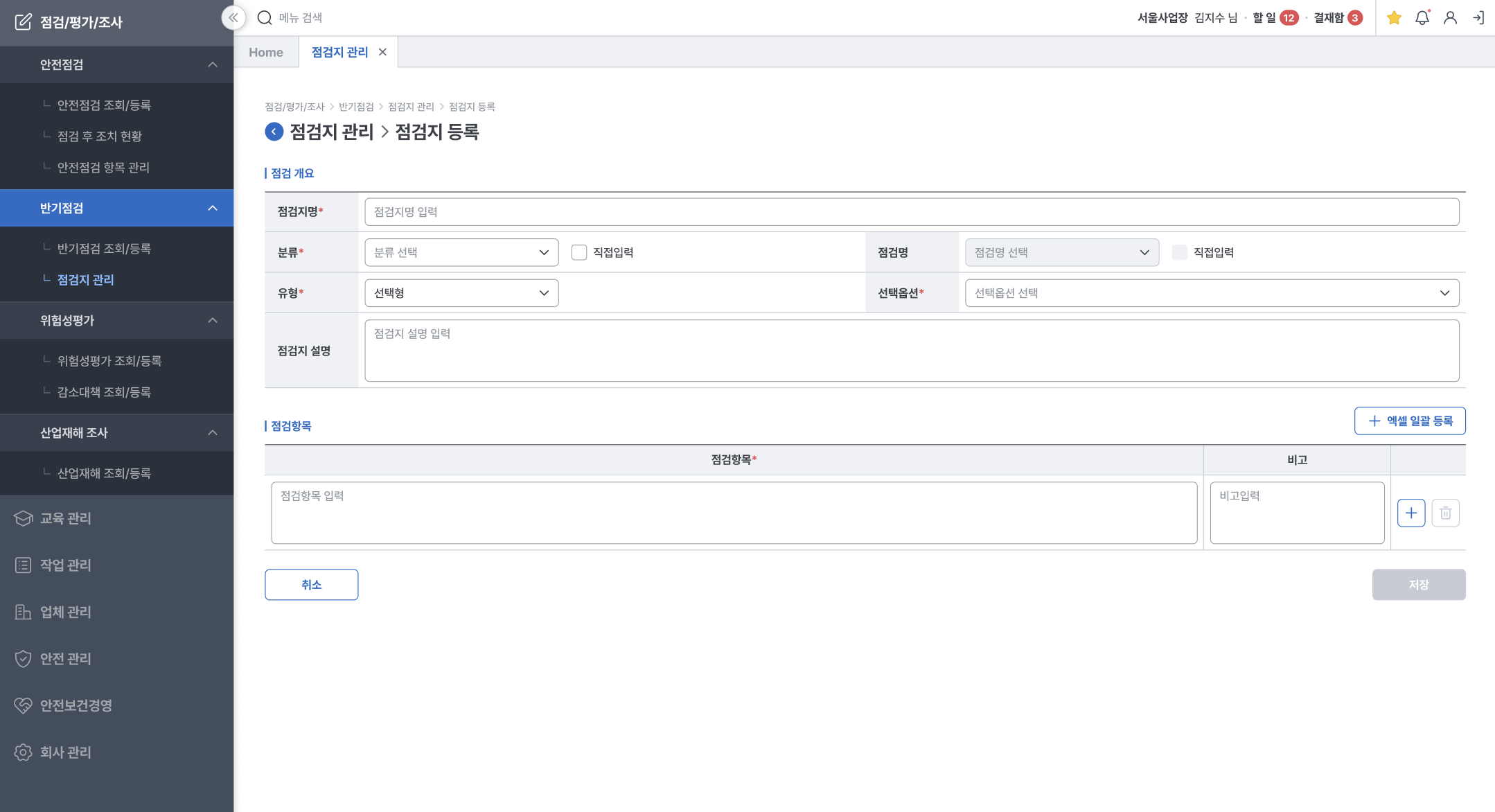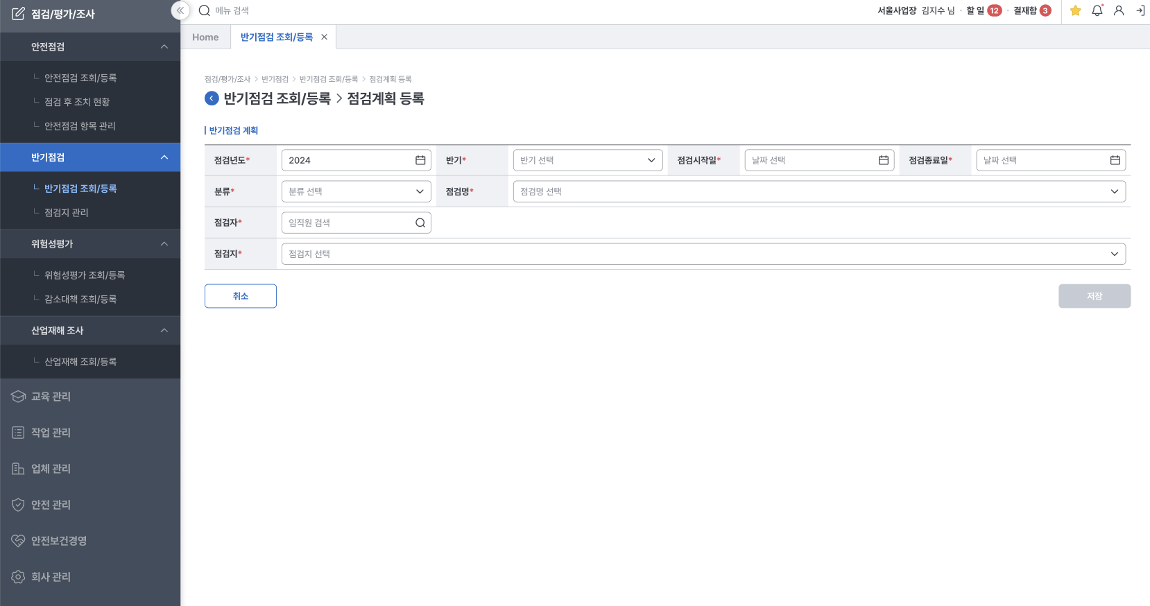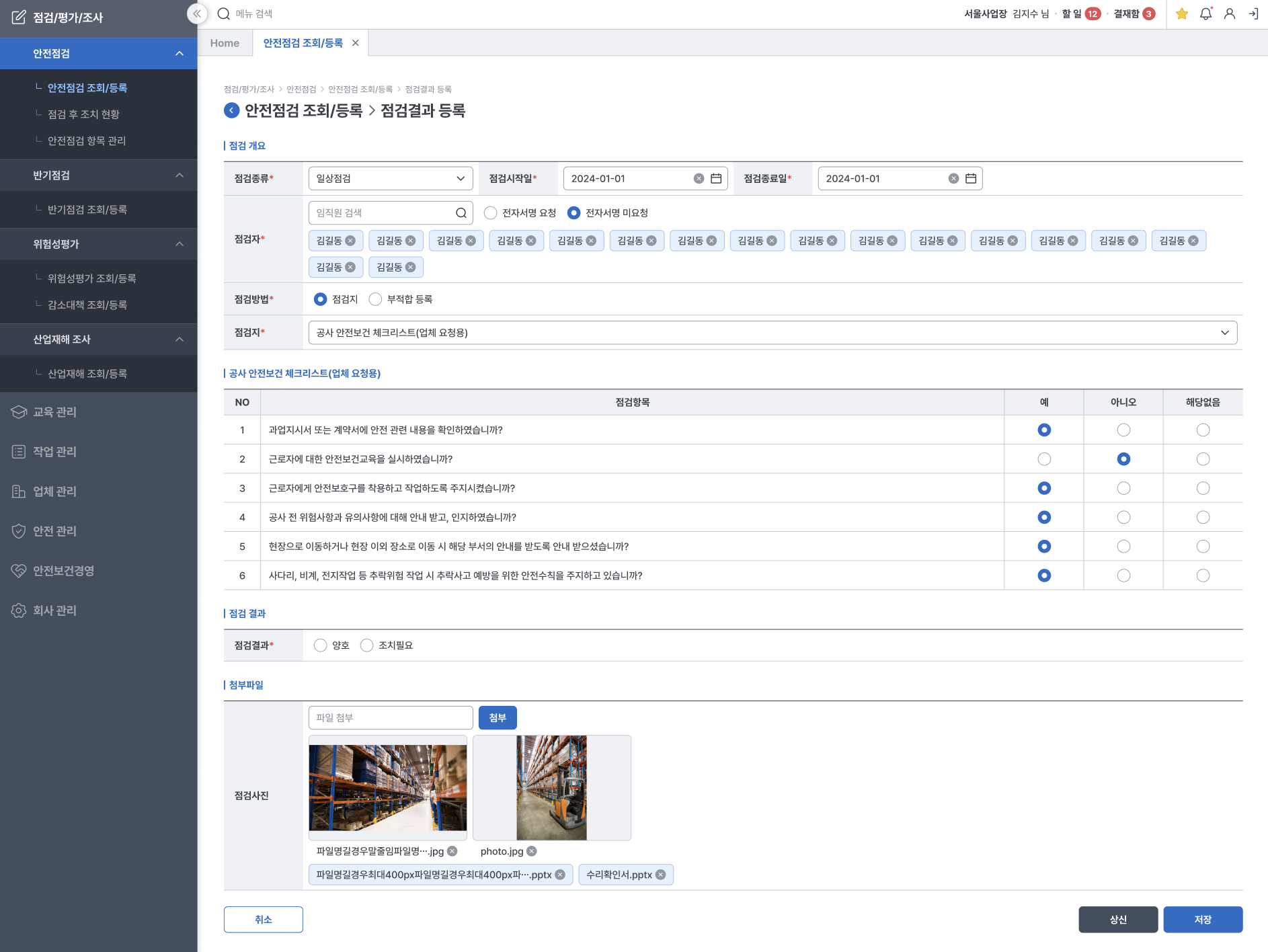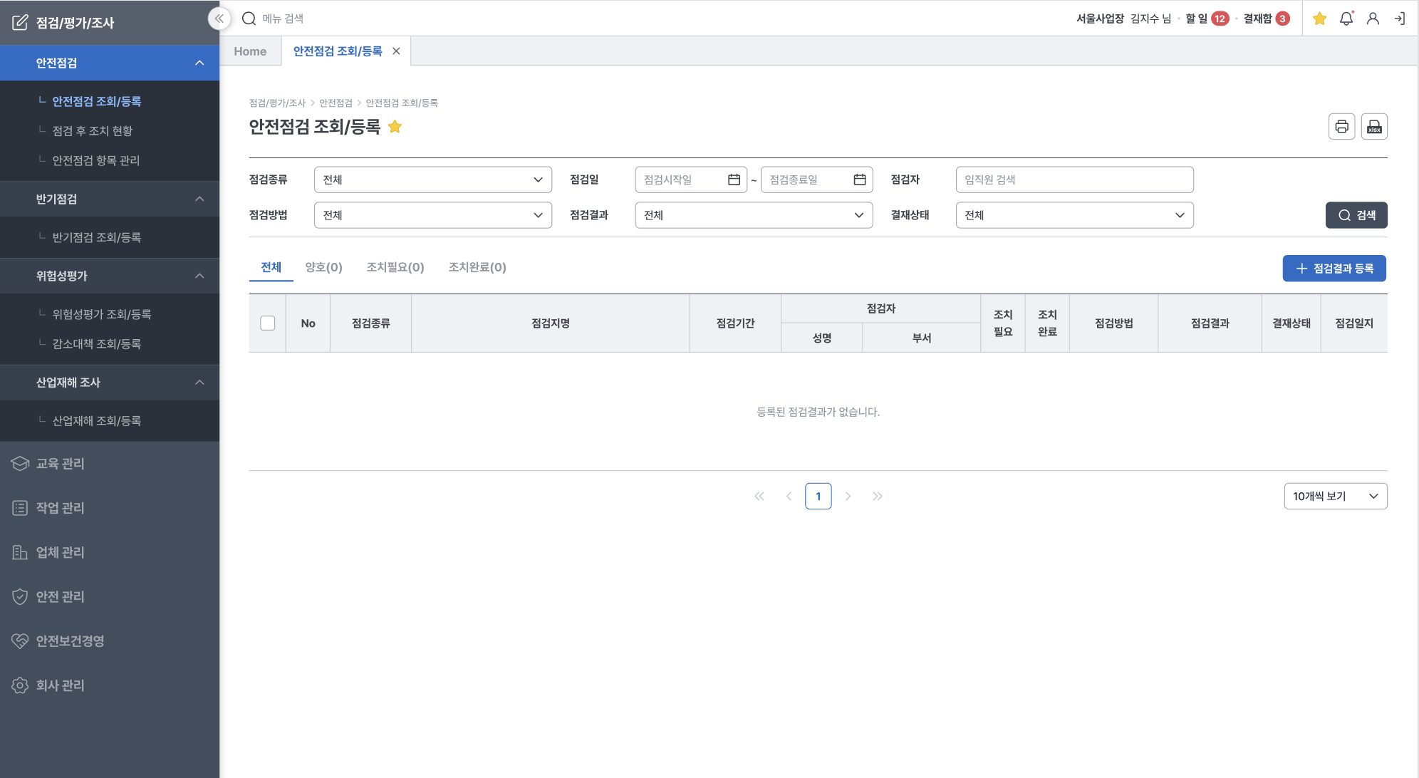 안전점검 조회/등록에서 점검 계획을 수립하고 결과를 기록합니다. 점검 결과 등록 시 점검 항목별 양호/불량 체크, 현장 사진 첨부, 조치 필요 사항 기록이 가능합니다. 미조치 건은 조치현황에서 별도 관리되며, 반기점검에서는 산업안전보건법 제47조에 따른 유해위험방지계획 이행 점검을 수행합니다. 점검지 관리에서 점검 항목 템플릿을 사전 구성하여 현장 점검의 일관성을 보장합니다.