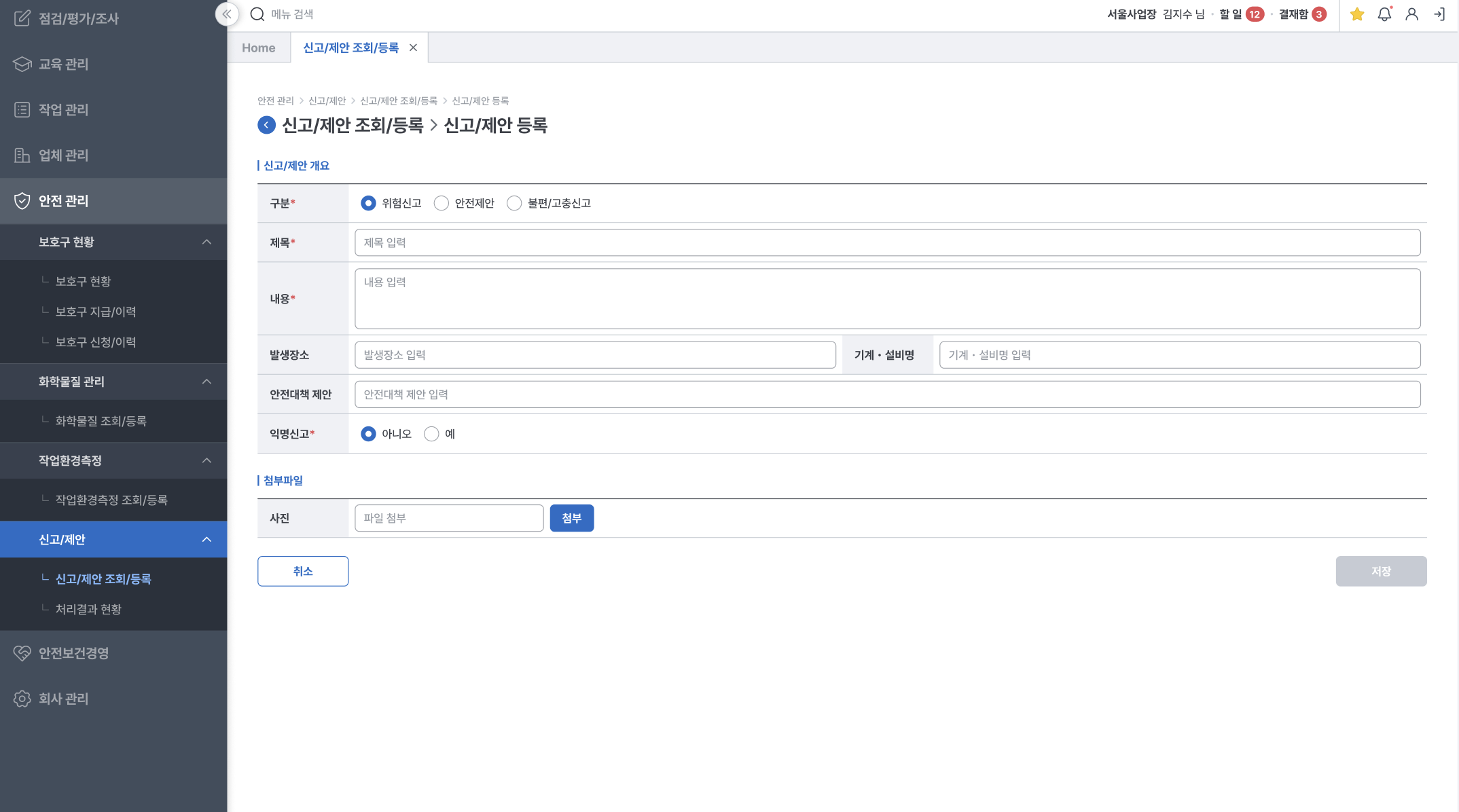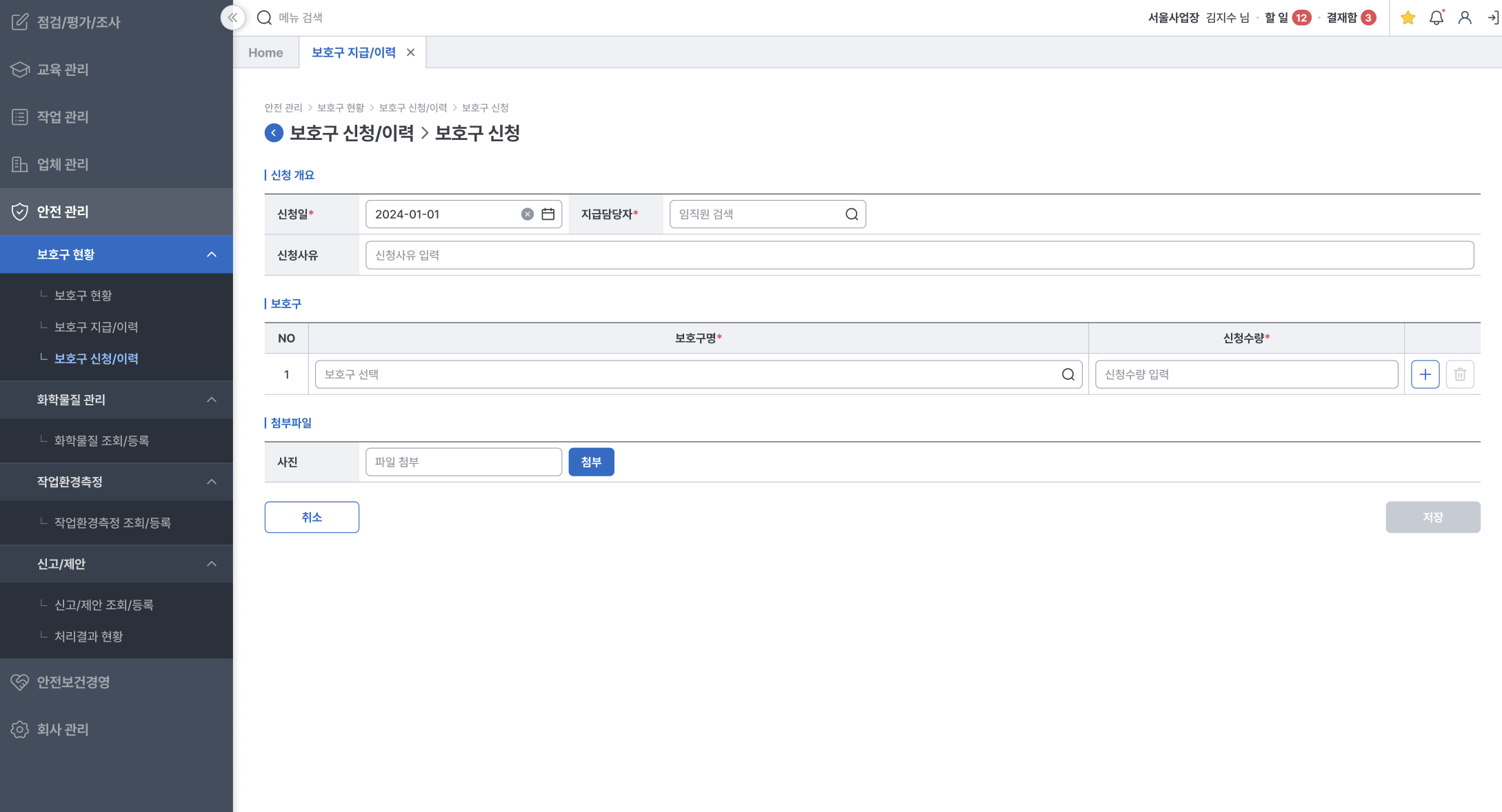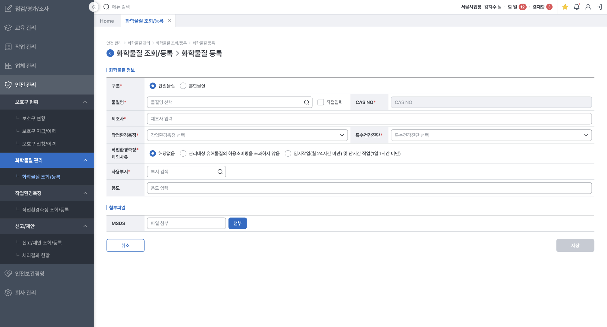 보호구 현황에서 보호구 재고를 관리하고, 신청이력·지급이력으로 근로자별 보호구 수불 이력을 추적합니다. 화학물질 조회/등록에서는 MSDS(물질안전보건자료) 첨부, CAS No. 관리, 작업환경측정 연계 등을 지원합니다. 작업환경측정에서 유해인자별 측정 결과를 기록하고, 신고/제안 시스템으로 현장 근로자의 위험 신고와 개선 제안을 접수·처리합니다.
