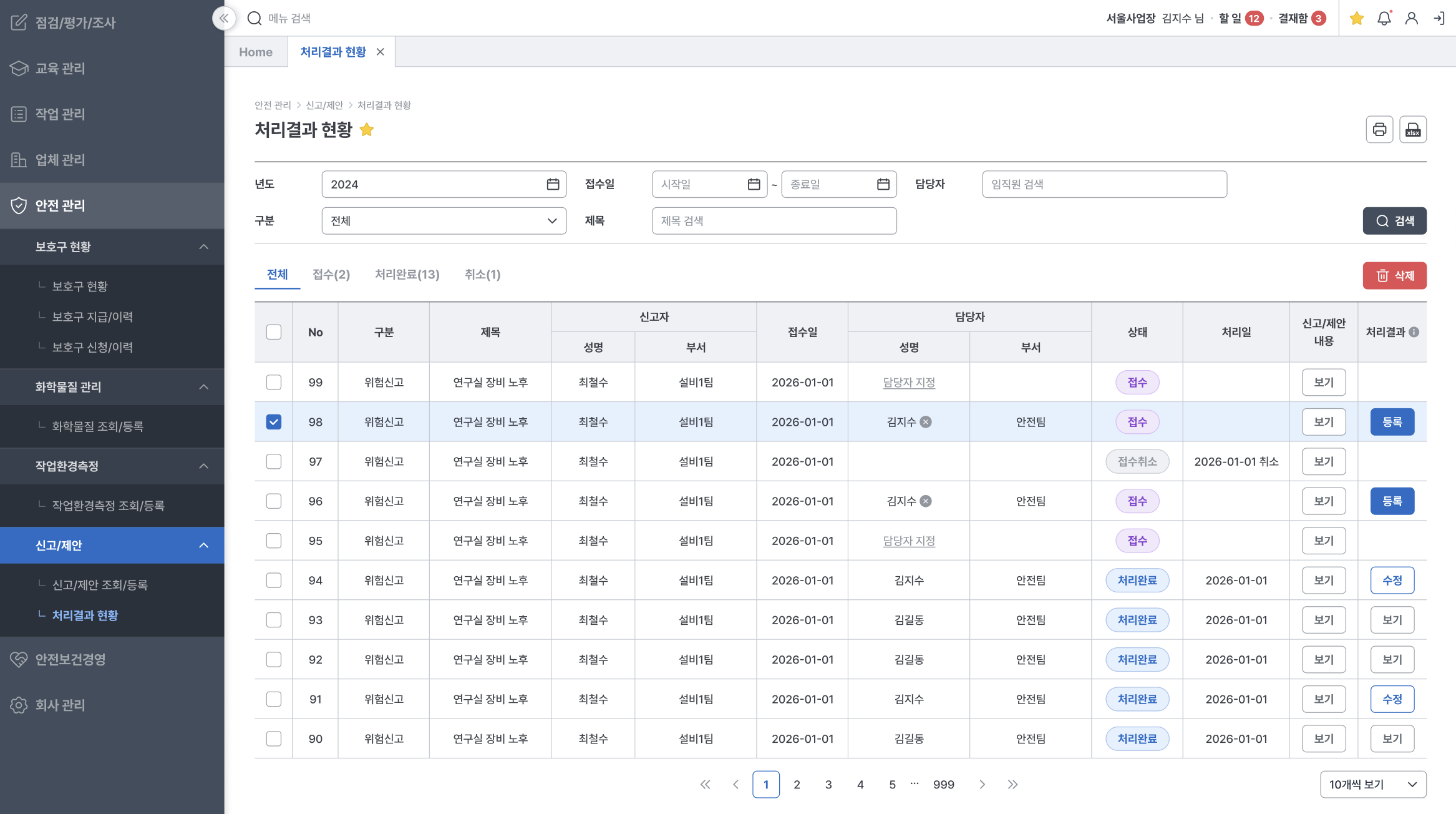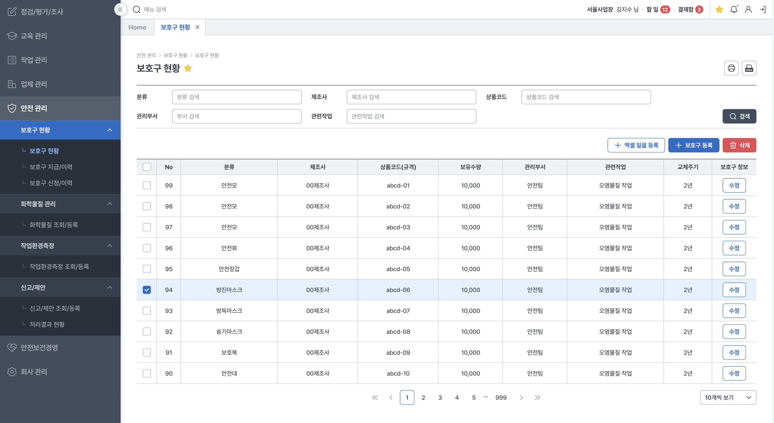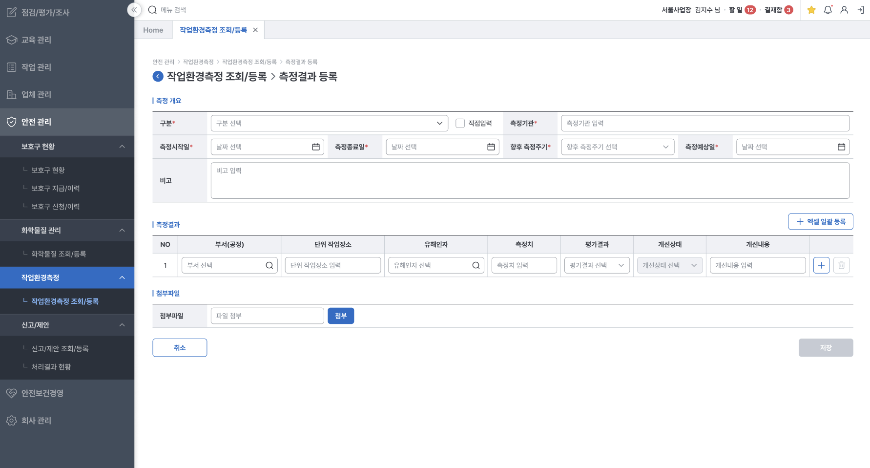 보호구 현황에서 보호구 재고를 관리하고, 신청이력·지급이력으로 근로자별 보호구 수불 이력을 추적합니다. 화학물질 조회/등록에서는 MSDS(물질안전보건자료) 첨부, CAS No. 관리, 작업환경측정 연계 등을 지원합니다. 작업환경측정에서 유해인자별 측정 결과를 기록하고, 신고/제안 시스템으로 현장 근로자의 위험 신고와 개선 제안을 접수·처리합니다.