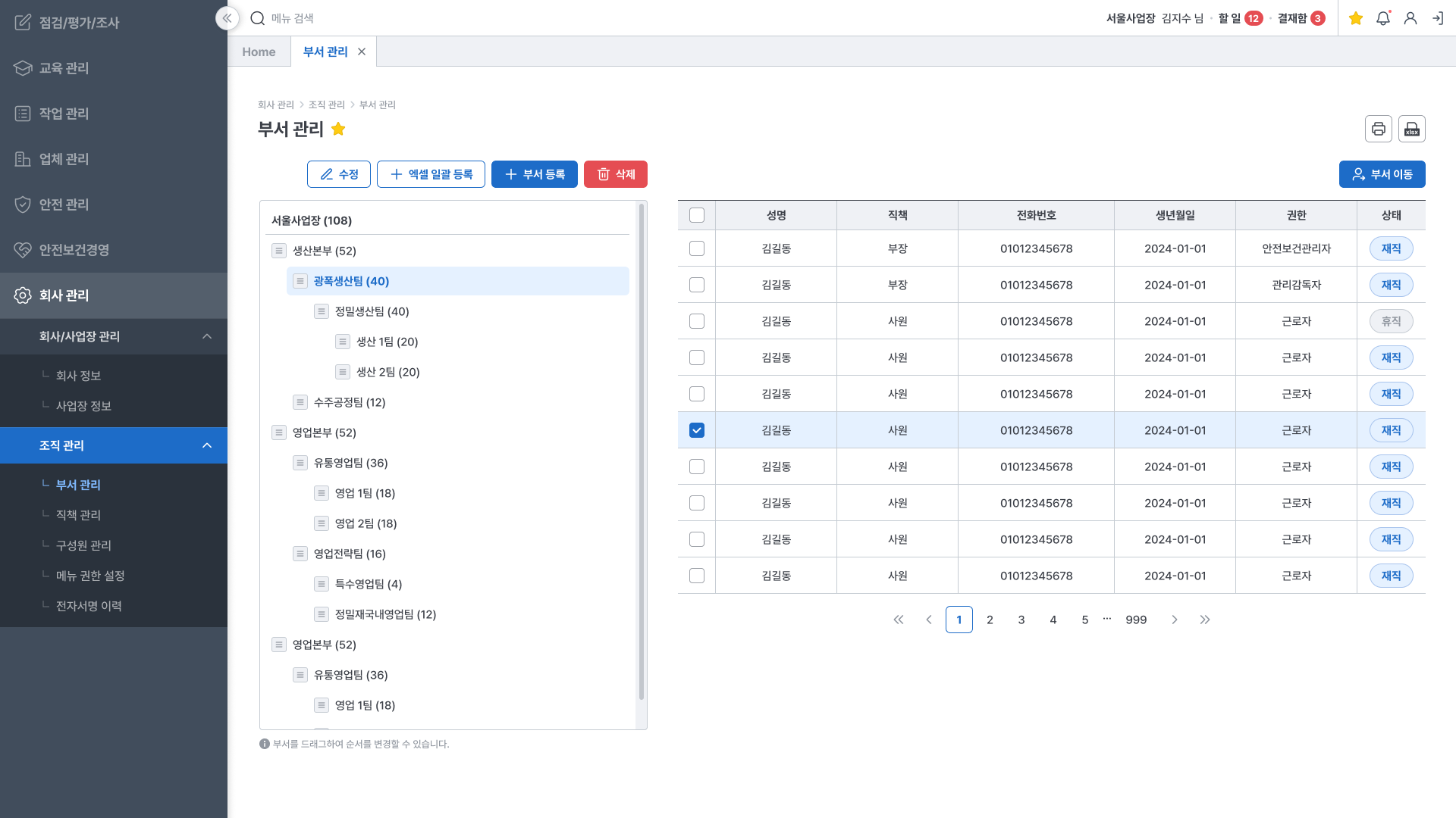 특히 멀티테넌시(Multi-tenancy) 아키텍처를 채택하여 하나의 시스템으로 다수의 사업장을 독립적으로 관리할 수 있으며, 사업장별 역할 기반 접근 제어(RBAC)와 메뉴 단위 권한 설정으로 세밀한 보안 정책을 적용합니다.