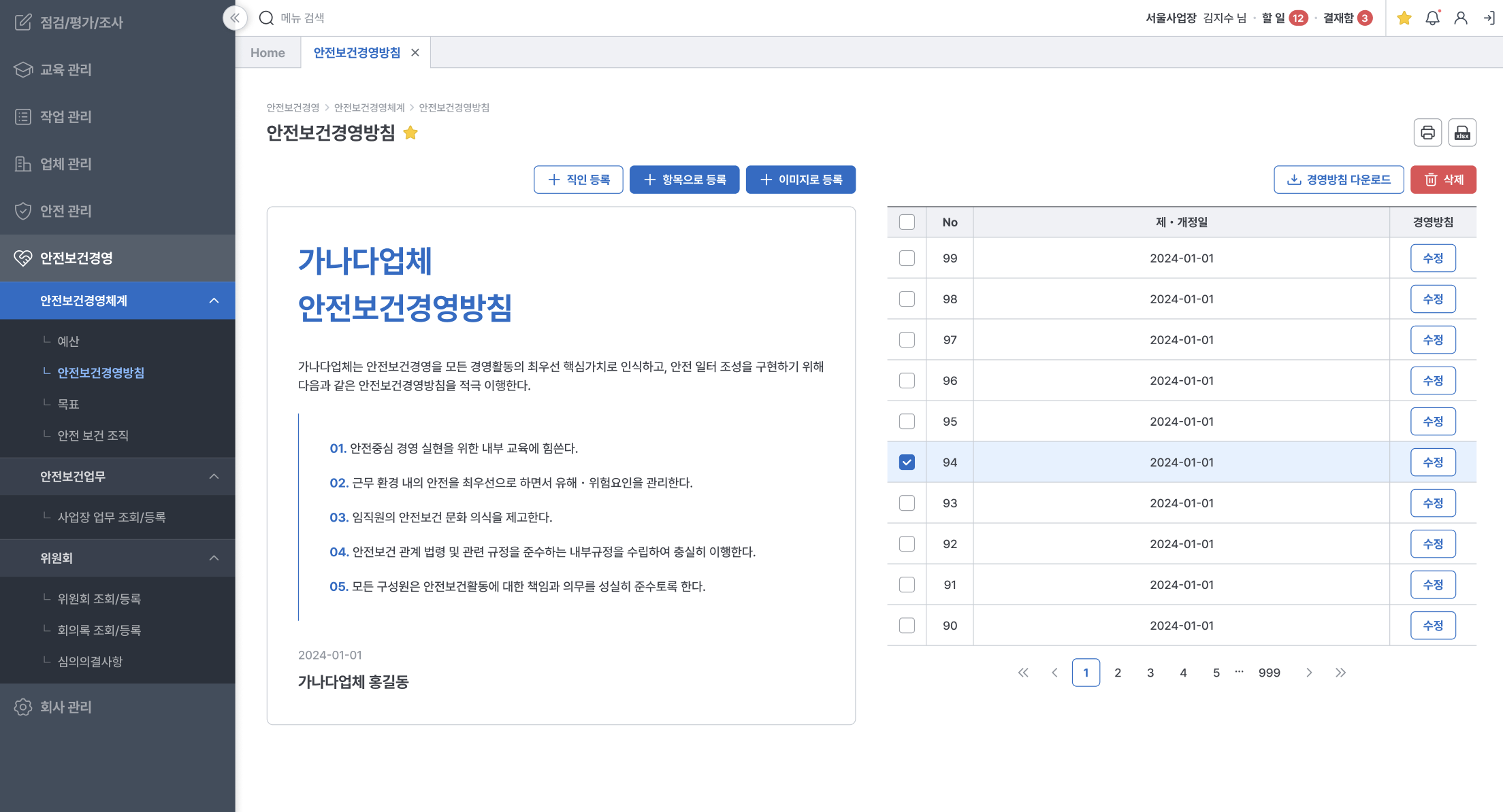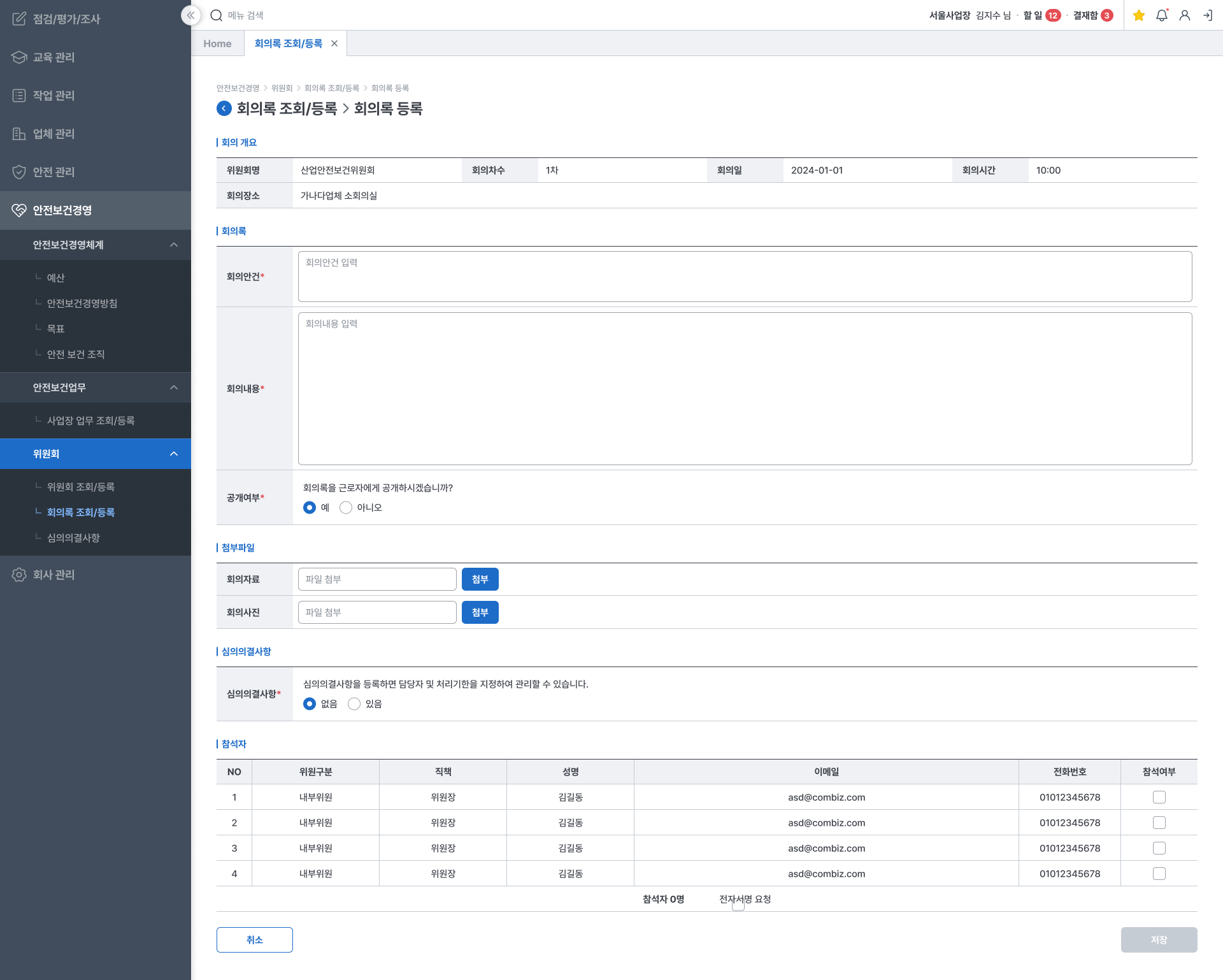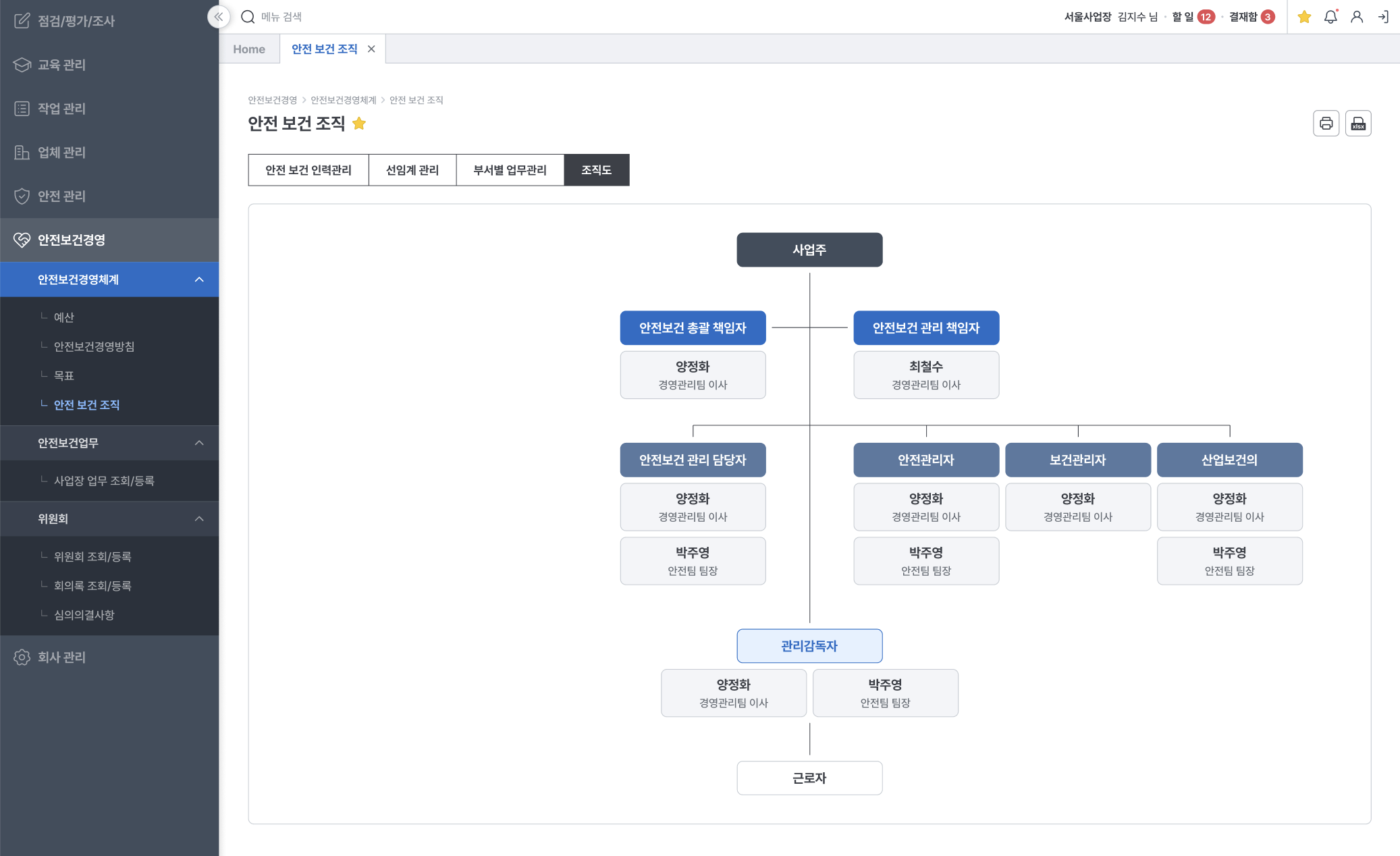 안전보건경영방침을 등록·관리하고, 안전보건 조직을 인력관리·선임계관리·부서별 업무관리·D3 기반 인터랙티브 조직도로 시각화합니다. 예산에서 안전보건 예산 편성과 집행 내역을 관리하고, 목표에서 연간 안전보건 목표와 실적을 추적합니다. 위원회에서 산업안전보건위원회 구성·규정·회의록·안건·심의의결사항을 체계적으로 관리합니다.