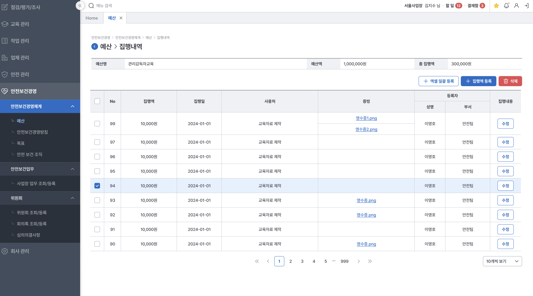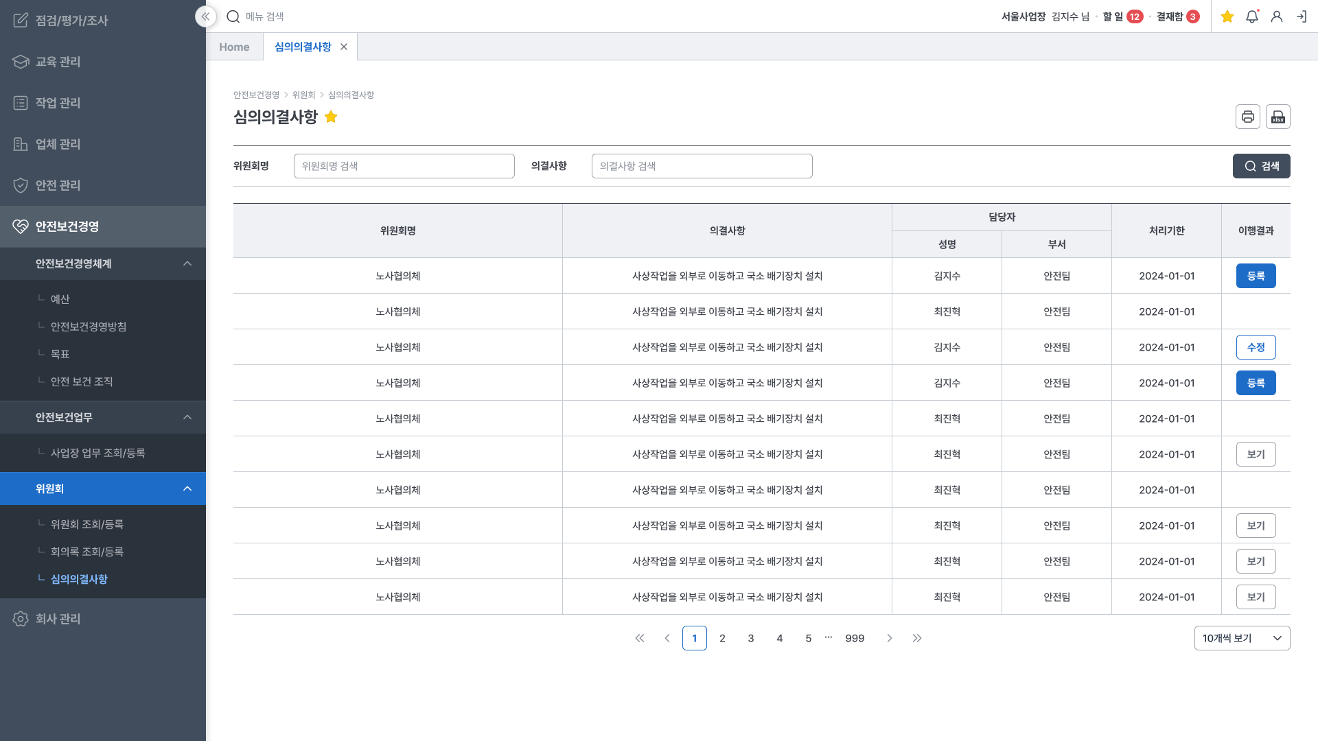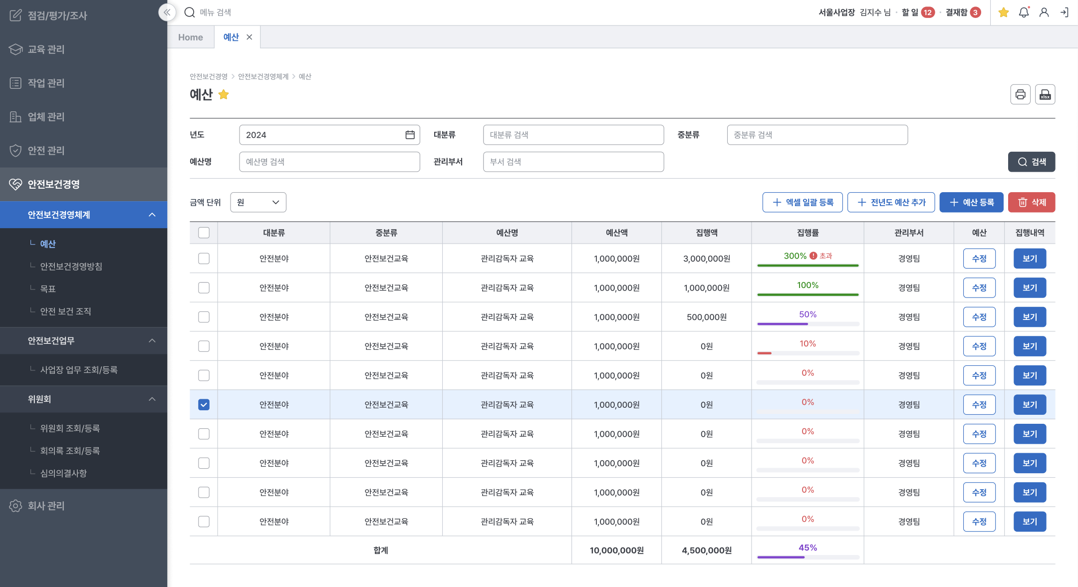 안전보건경영방침을 등록·관리하고, 안전보건 조직을 인력관리·선임계관리·부서별 업무관리·D3 기반 인터랙티브 조직도로 시각화합니다. 예산에서 안전보건 예산 편성과 집행 내역을 관리하고, 목표에서 연간 안전보건 목표와 실적을 추적합니다. 위원회에서 산업안전보건위원회 구성·규정·회의록·안건·심의의결사항을 체계적으로 관리합니다.