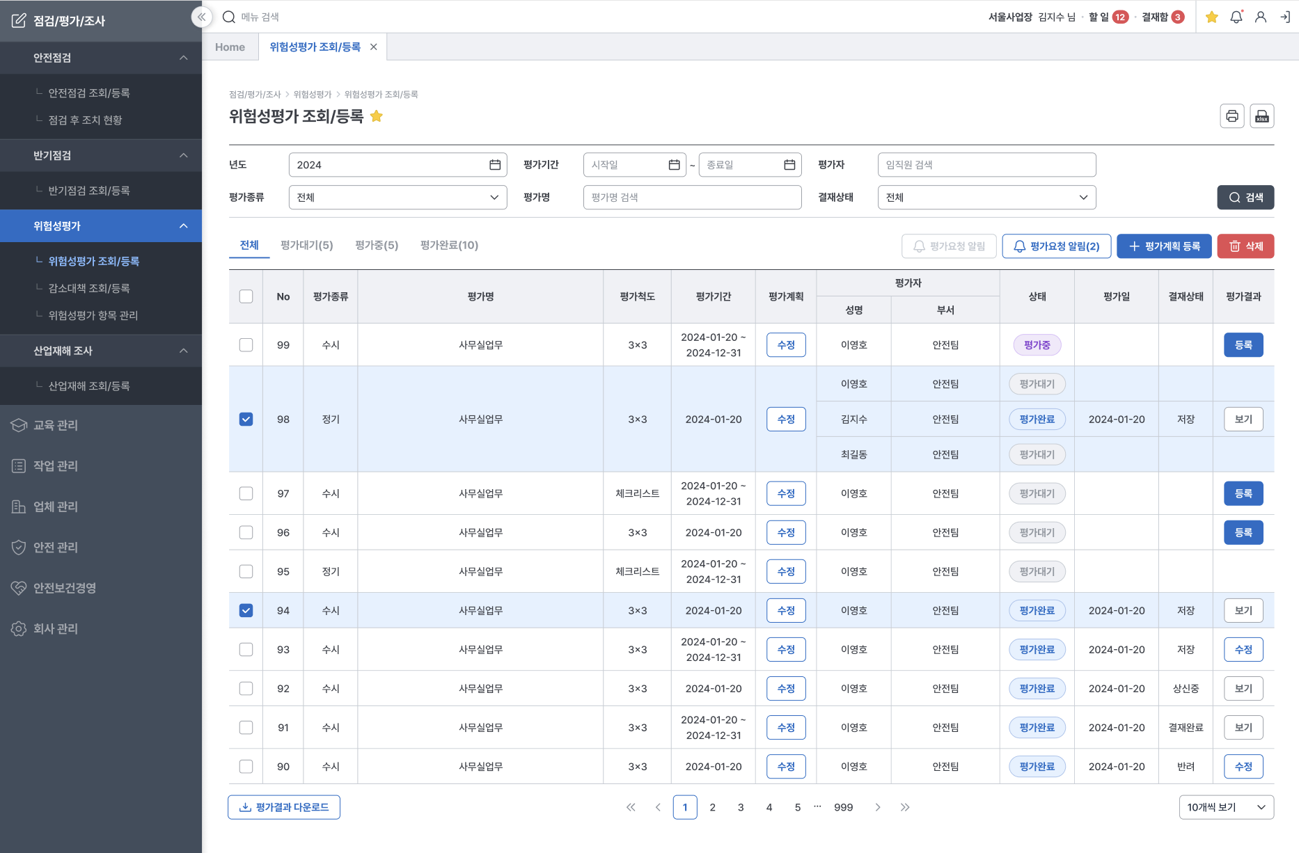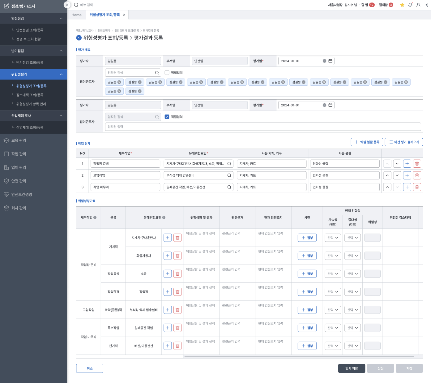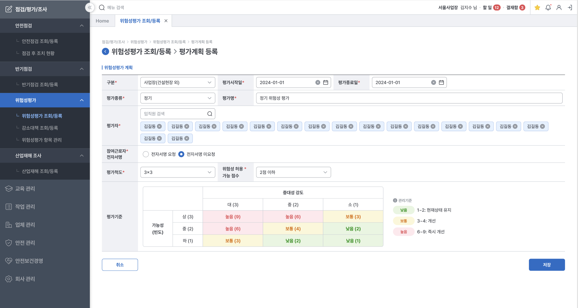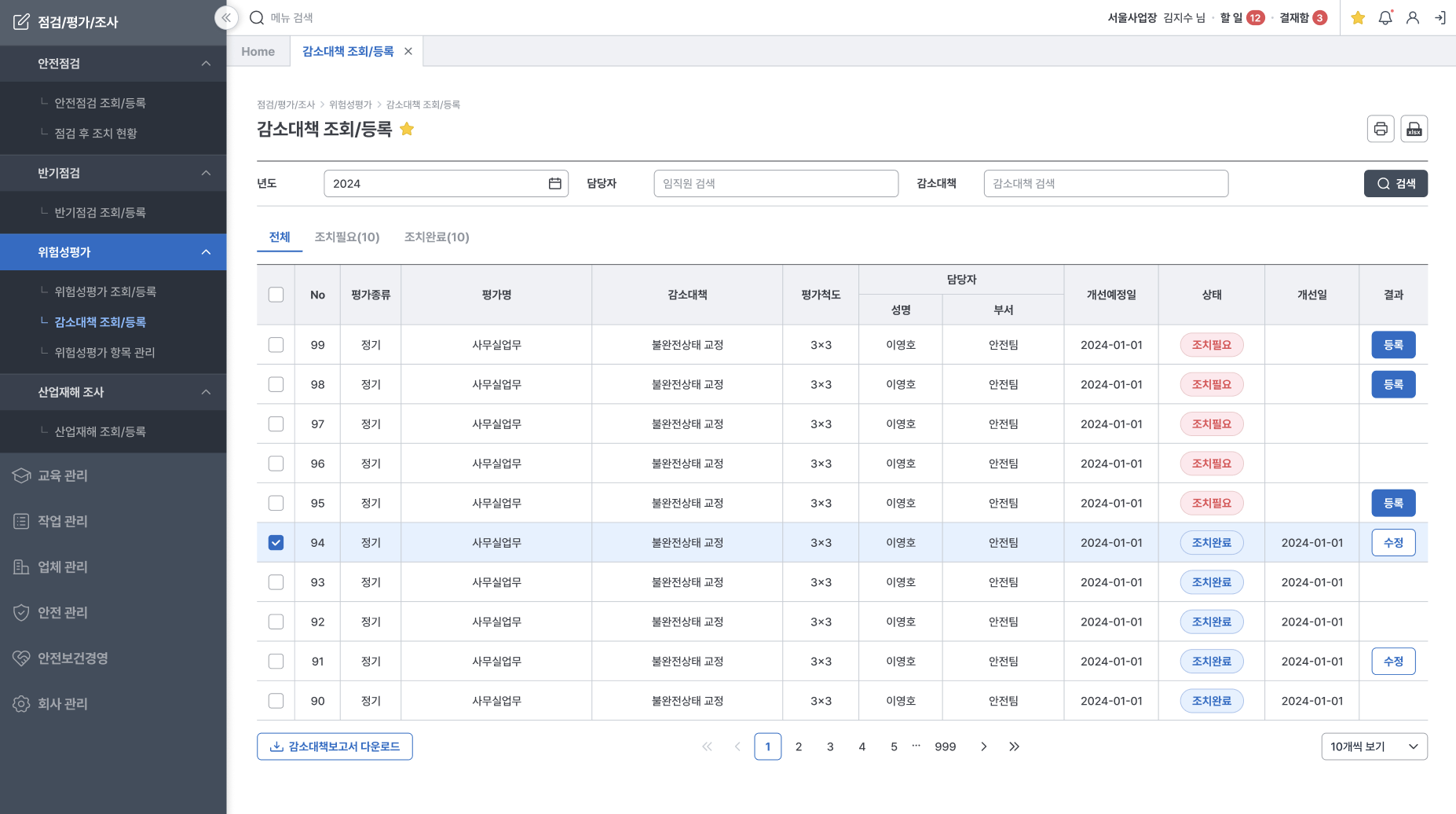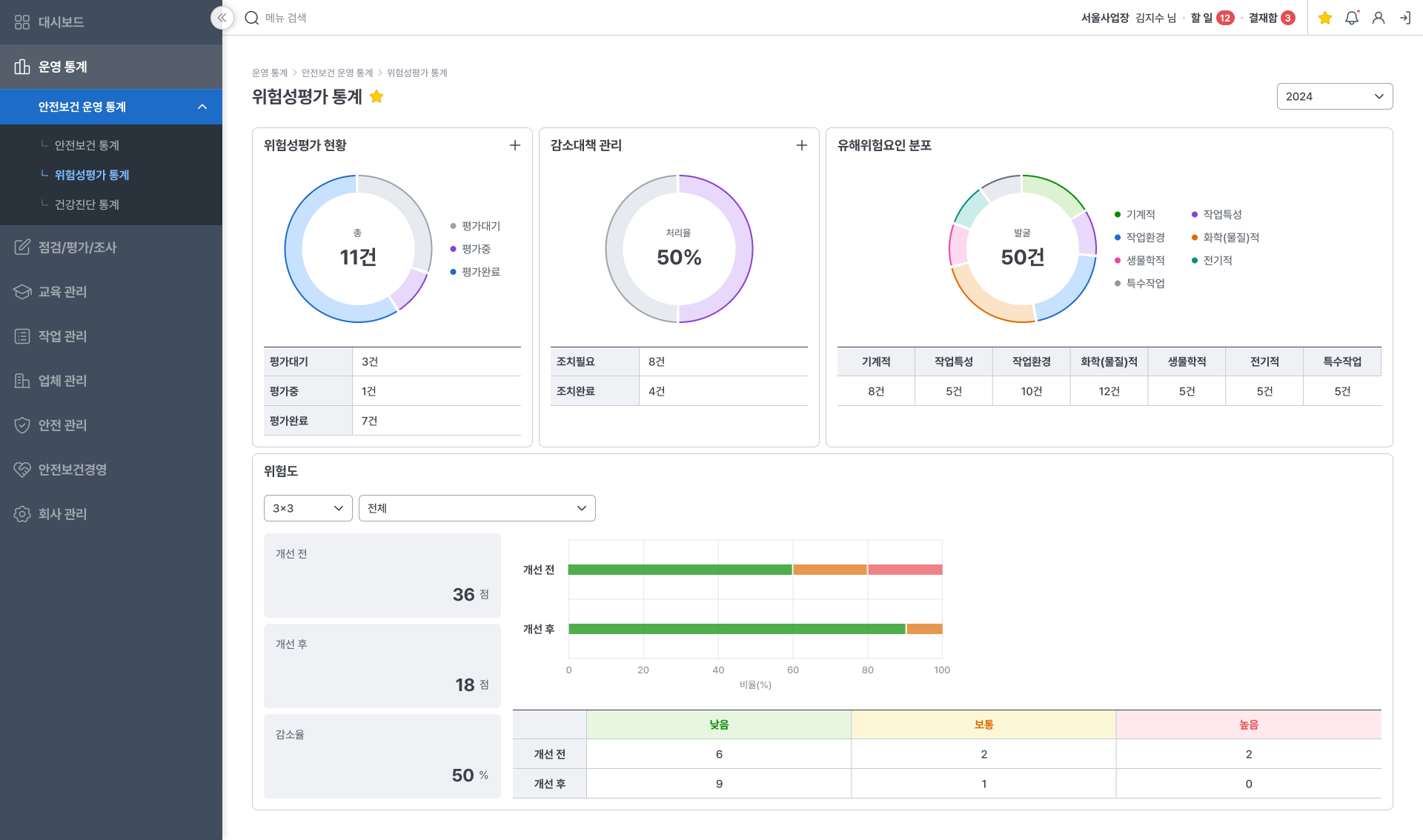 산업안전보건법 제36조에 따른 위험성평가 전 과정을 디지털로 관리합니다. 평가계획 수립 → 유해위험요인 파악 → 위험성 결정 → 감소대책 수립 → 이행 확인의 5단계 프로세스를 시스템이 안내하며, 각 단계별 상태(평가대기·평가중·평가완료)를 실시간 추적합니다. 감소대책은 별도 목록에서 이행 현황을 관리하고, 위험도 3×3 매트릭스로 개선 전후 위험 수준을 비교합니다.