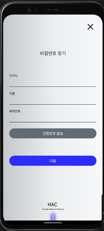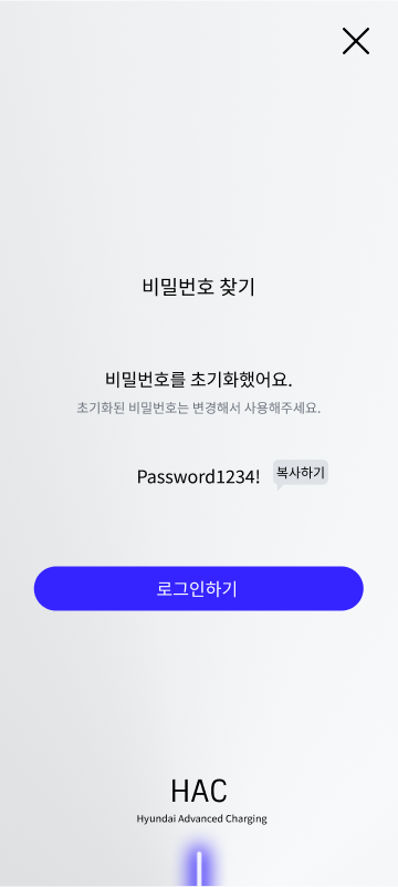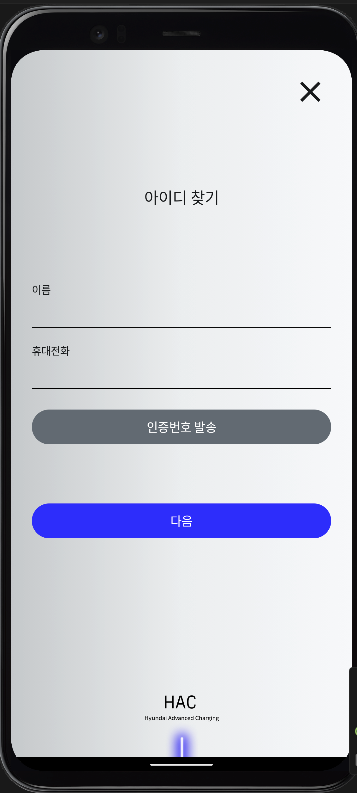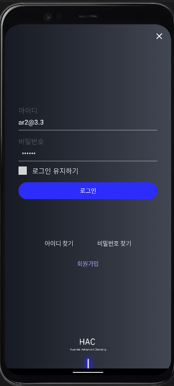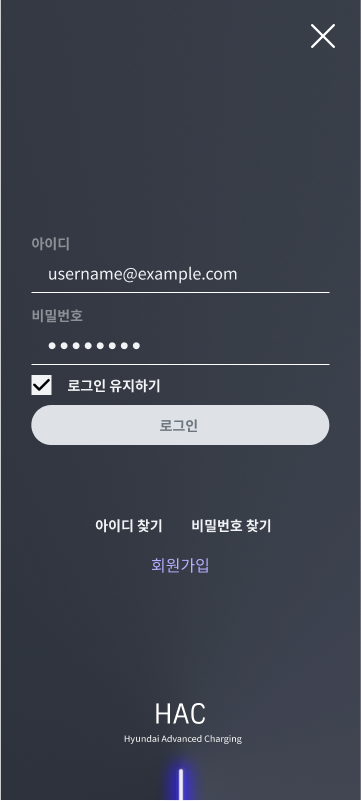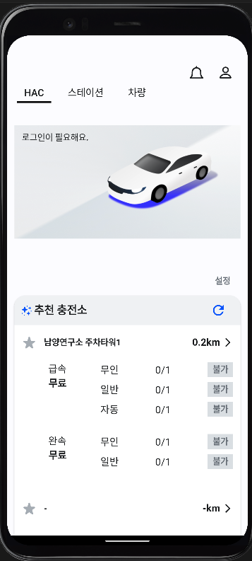 앱 진입 시 로그인 없이도 추천 충전소와 기본 정보를 확인할 수 있고, 차량 등록이나 충전 예약 등 핵심 기능 이용 시 로그인을 유도합니다. Supabase GoTrue 기반 인증으로 회원가입, 로그인, 아이디/비밀번호 찾기를 지원합니다.