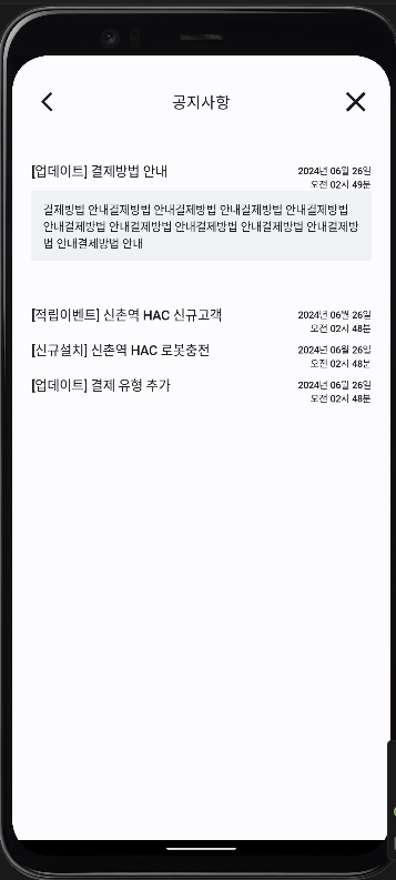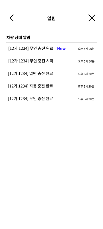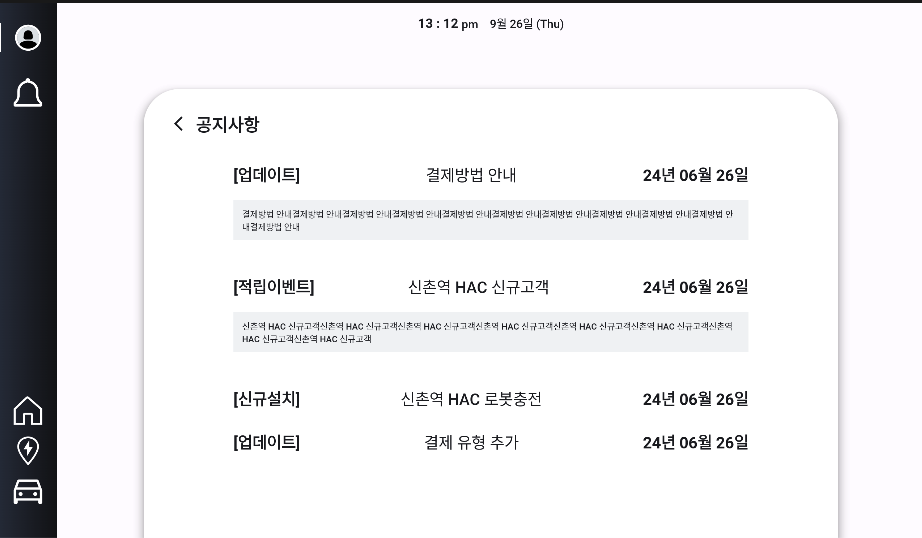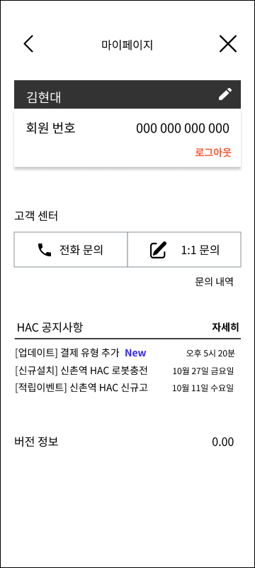 마이페이지에서는 회원 정보 확인, 고객센터(전화 문의, 1:1 문의), 공지사항 열람이 가능합니다. 알림 센터는 충전 시작/완료, 예약 확인, 차량 등록 승인 등 주요 이벤트를 실시간 푸시 알림과 함께 인앱 목록으로 관리합니다.