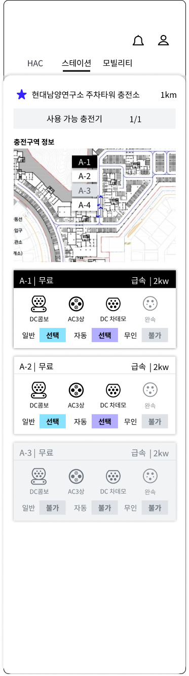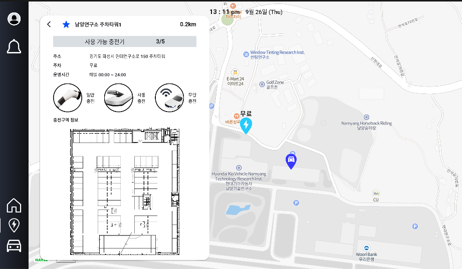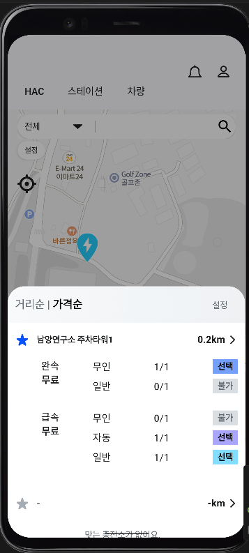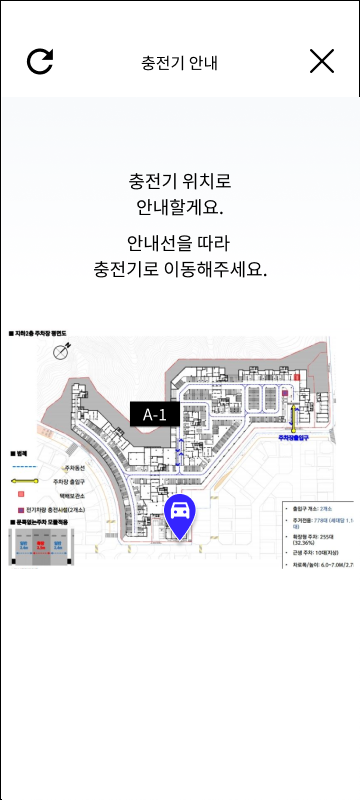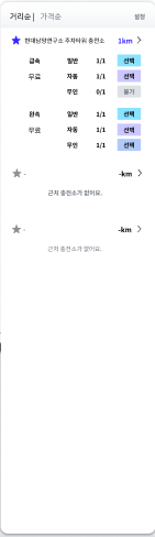 충전소를 선택하면 충전기 상세 정보, 위치 안내, 목록 보기 등 다양한 뷰를 제공합니다. 충전기별 출력(kW), 과금 정보, 현재 상태(충전 가능/사용 중/고장)를 실시간으로 확인할 수 있습니다.