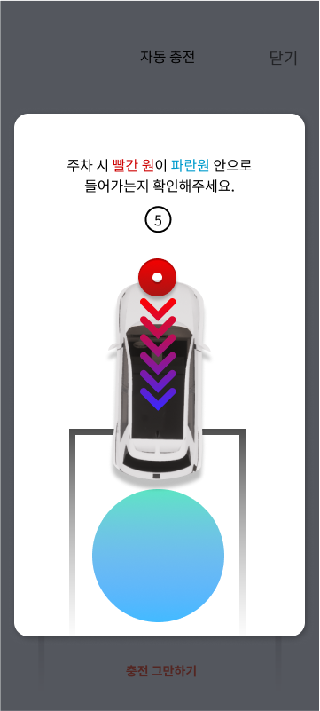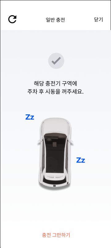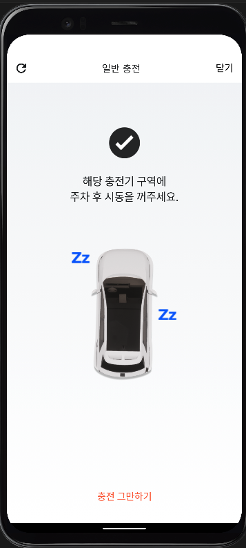충전기를 선택하면 6단계 절차 안내가 시작됩니다. 각 단계마다 3D 차량 애니메이션과 함께 직관적인 가이드를 제공하여 처음 이용하는 사용자도 쉽게 충전할 수 있습니다. 충전이 시작되면 전력(kW), 충전량(kWh), 남은 시간, 경과 시간, 충전 요금을 실시간으로 모니터링할 수 있습니다.