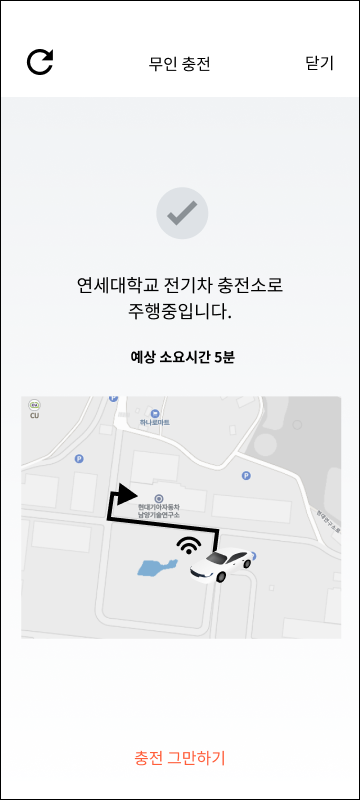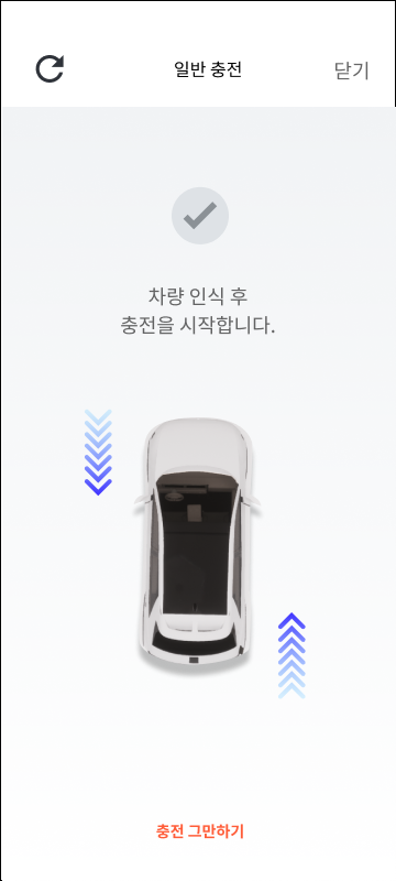 앱에서 충전소를 선택하면 6단계 절차 안내를 거쳐 충전이 시작됩니다. 일반 충전(수동 플러그), 자동 충전(PnC 인증), 로봇/무인 충전(로봇팔) 세 가지 모드를 지원합니다.