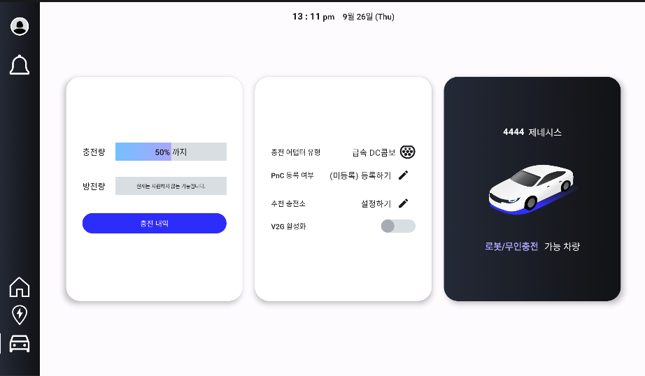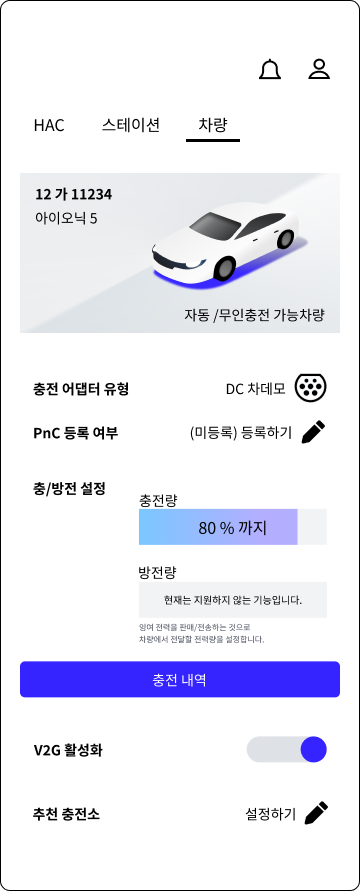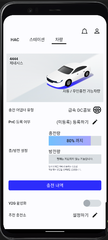 등록된 전기차의 상세 정보를 관리합니다. 충전 어댑터 유형(DC 차데모, DC 콤보 등), PnC(Plug & Charge) 등록 여부, V2G(Vehicle-to-Grid) 활성화, 충전/방전량 설정(목표 SOC)을 설정할 수 있습니다. 아이오닉 5, 제네시스 등 현대차 전기차 모델을 지원하며, 차량 등록 시 관리자 승인 프로세스를 거칩니다.