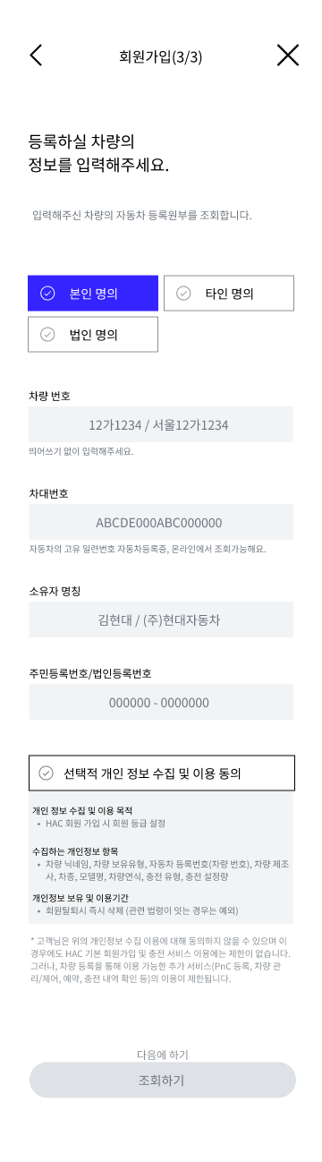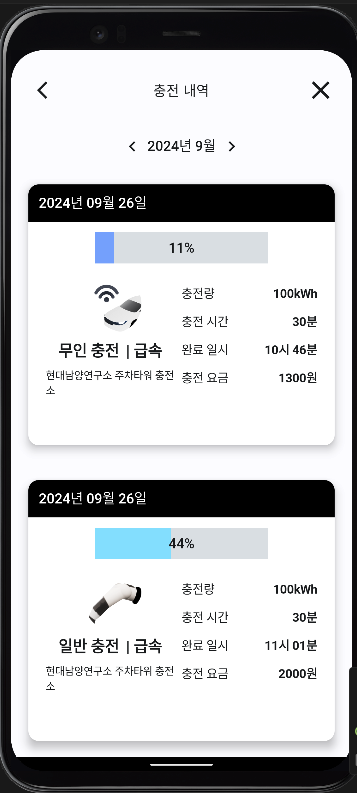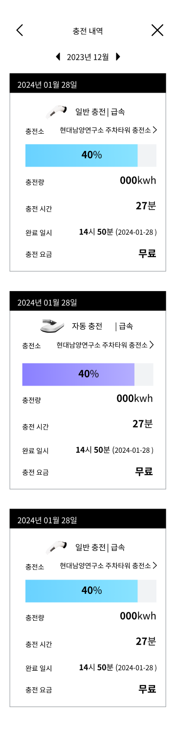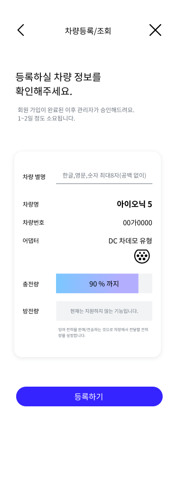 차량 등록은 차량 번호, 모델명, 충전 어댑터 유형을 입력한 뒤 관리자 승인을 거치는 흐름입니다. 승인 후에는 해당 차량의 충전 내역을 날짜별·충전소별로 조회할 수 있습니다.