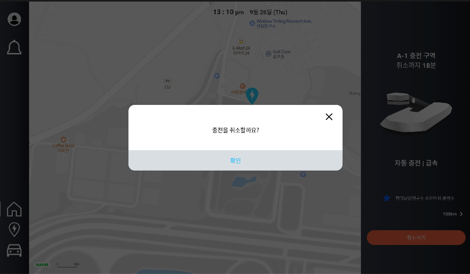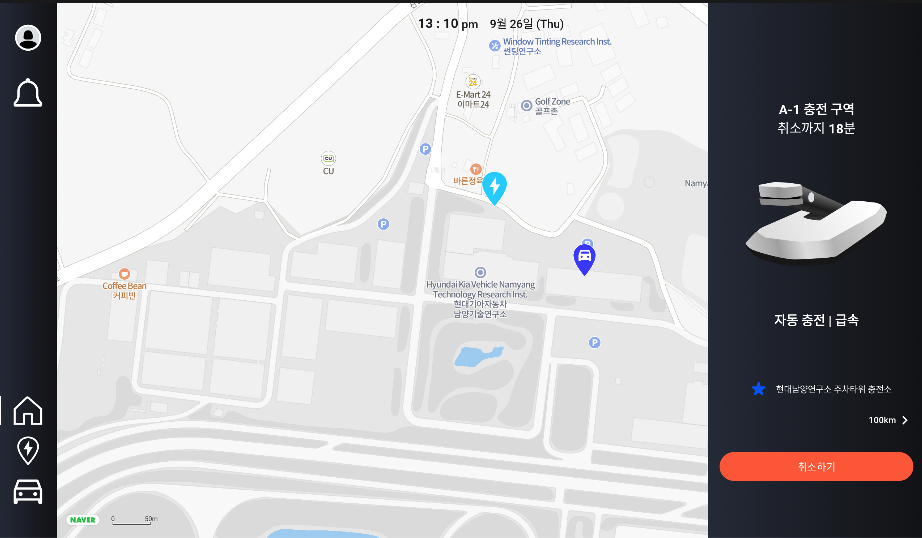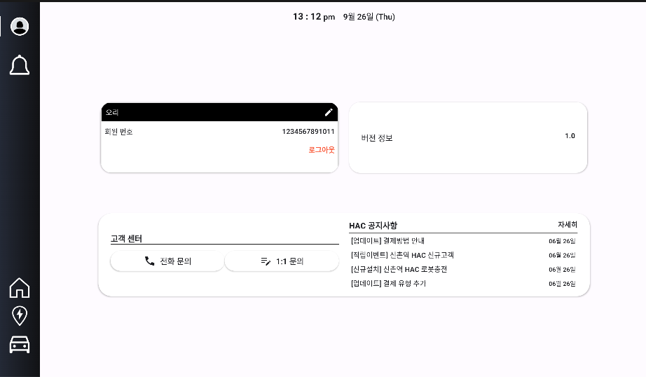 IVIS 전용 마이페이지에서 계정 정보 확인, 비밀번호 변경, 차량 관리 기능을 제공합니다. 알림은 모바일 앱과 동기화되어 충전 상태 변경, 예약 알림 등을 차량 디스플레이에서도 확인할 수 있습니다.