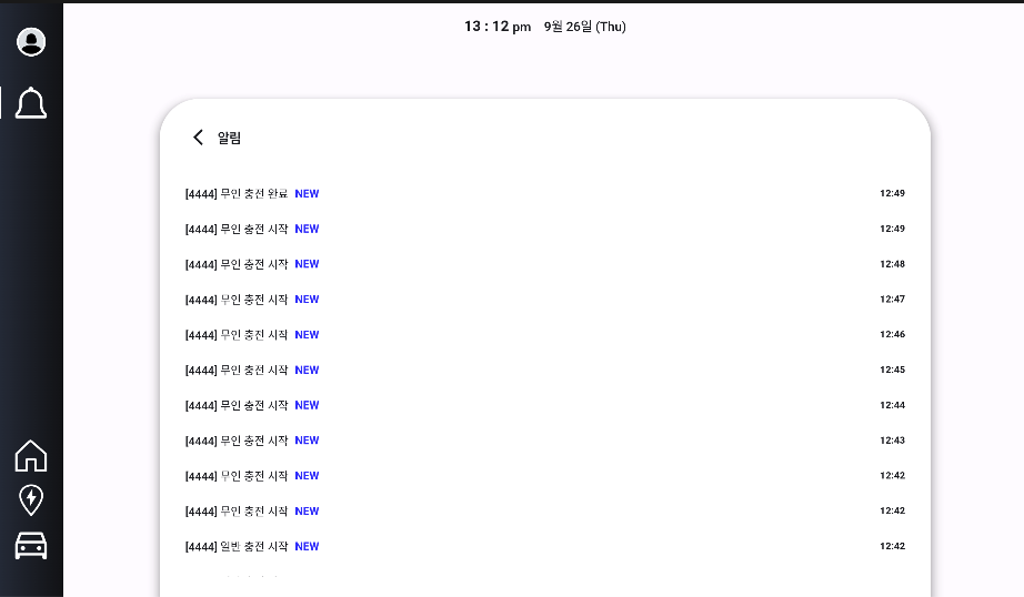 차량 내 태블릿(In-Vehicle Infotainment System)에 탑재되는 전용 인터페이스입니다. 가로(Landscape) 모드에 최적화된 다크 테마 UI로, 운전 중에도 충전 상태를 쉽게 확인할 수 있도록 대형 텍스트와 직관적인 레이아웃을 적용했습니다. 모바일 앱과 동일한 Kotlin 코드베이스에서 디바이스 방향(Landscape)을 감지하여 자동으로 IVIS 모드로 전환됩니다.