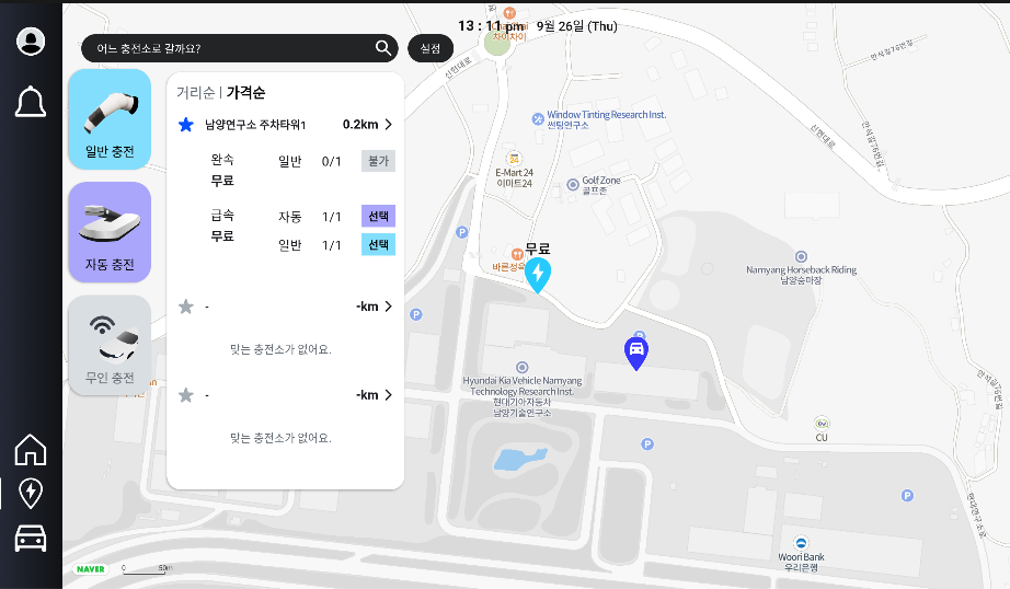 차량 내 디스플레이에서 네이버 지도로 주변 충전소를 검색하고, 일반 충전·자동 충전·무인 충전 아이콘으로 충전 방식을 한눈에 구분합니다. 왼쪽 패널에서 충전 방식을 필터링하고, 오른쪽 지도에서 위치를 확인하는 분할 화면(Split View) 레이아웃입니다.