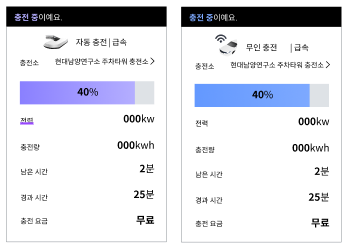 IVIS의 핵심 화면입니다. 충전 중인 차량의 실시간 상태를 대형 화면에서 모니터링합니다. 자동 충전과 무인 충전 모드를 나란히 비교하며, 전력(kW), 충전량(kWh), 남은 시간, 경과 시간, 충전 요금을 큰 글씨로 표시하여 운전석에서도 한눈에 확인할 수 있습니다. 충전 진행률은 프로그레스 바로 시각화됩니다.