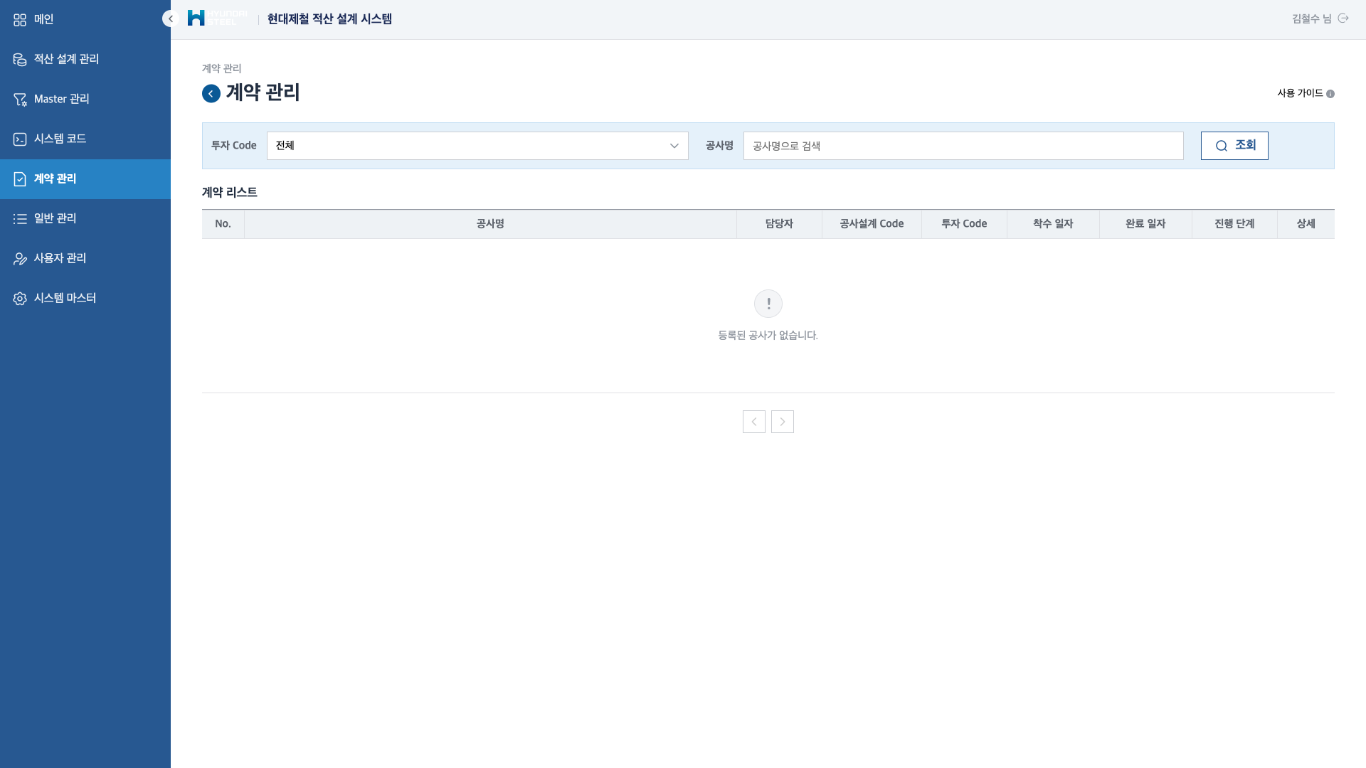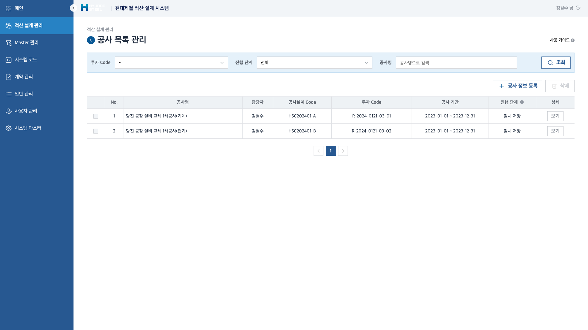 투자 Code, 진행 단계, 공사명으로 공사를 검색하고 관리합니다. 각 공사의 담당자, 공사설계 Code, 투자 Code, 공사 기간, 진행 단계를 일목요연하게 표시하며, 신규 공사 정보 등록과 삭제가 가능합니다. 임시 저장 → 결재 진행 → 완료의 단계별 흐름을 추적합니다.