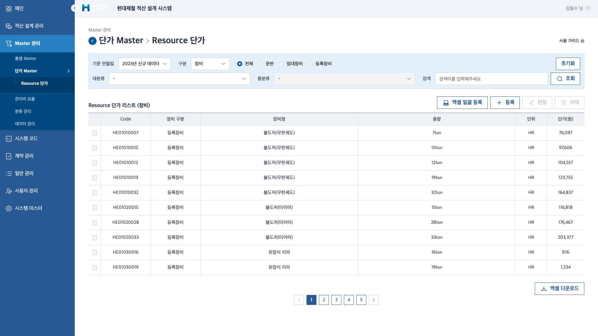 장비, 운반, 임대장비, 등록장비 등 자원 유형별 단가 정보를 관리합니다. 불도저, 유압식 리퍼 등 건설장비의 코드, 장비명, 용량, 단위(HR), 단가(원)를 체계적으로 등록합니다. 자재·노무·장비 3대 자원의 단가를 대분류·중분류 체계로 분류하여 관리하며, 엑셀 일괄 등록·다운로드를 지원합니다.
