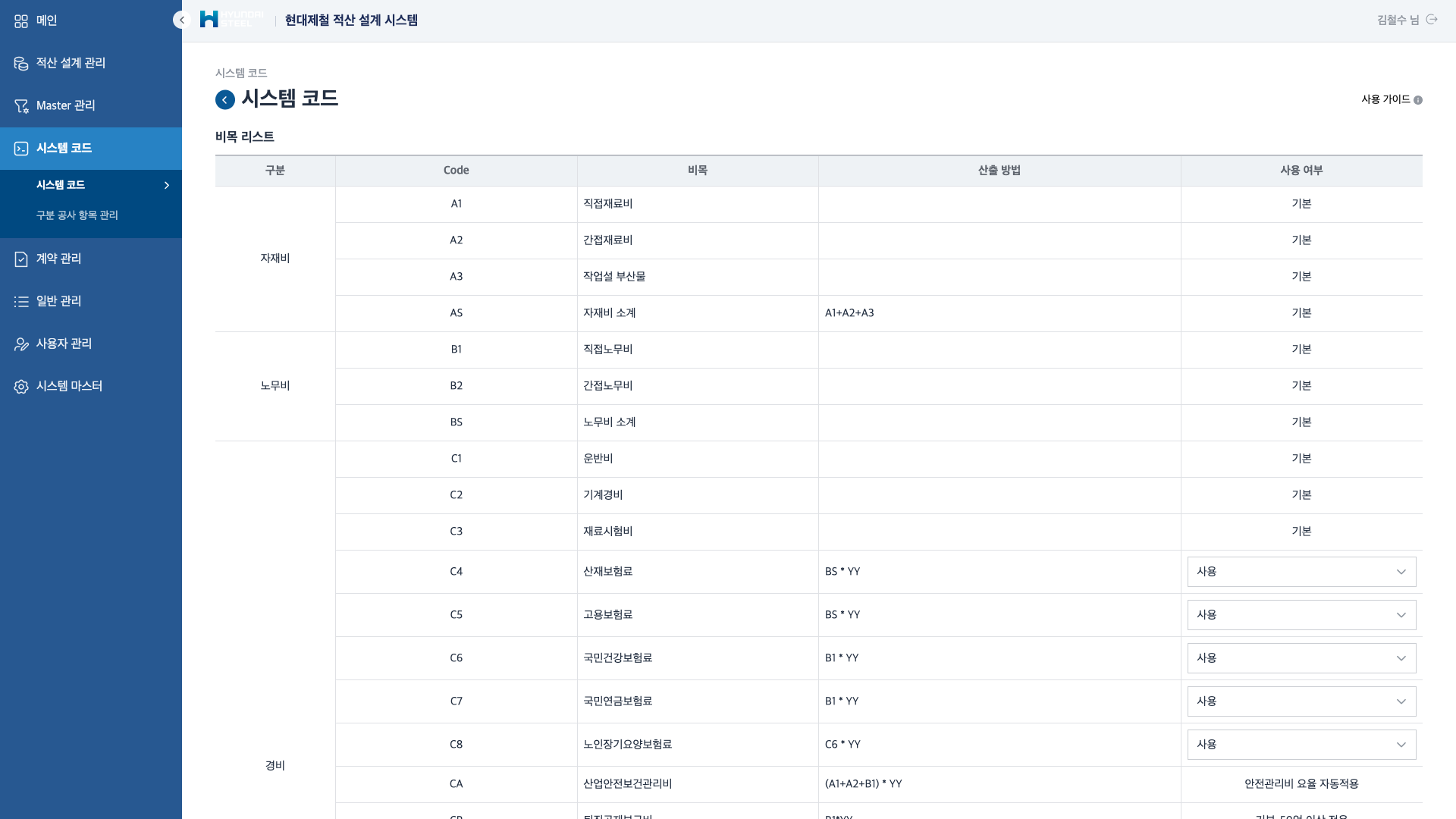 공사 원가는 자재비·노무비·경비의 3대 비목으로 구성되며, 각 비목의 산출 공식과 요율을 시스템 코드로 정의합니다.