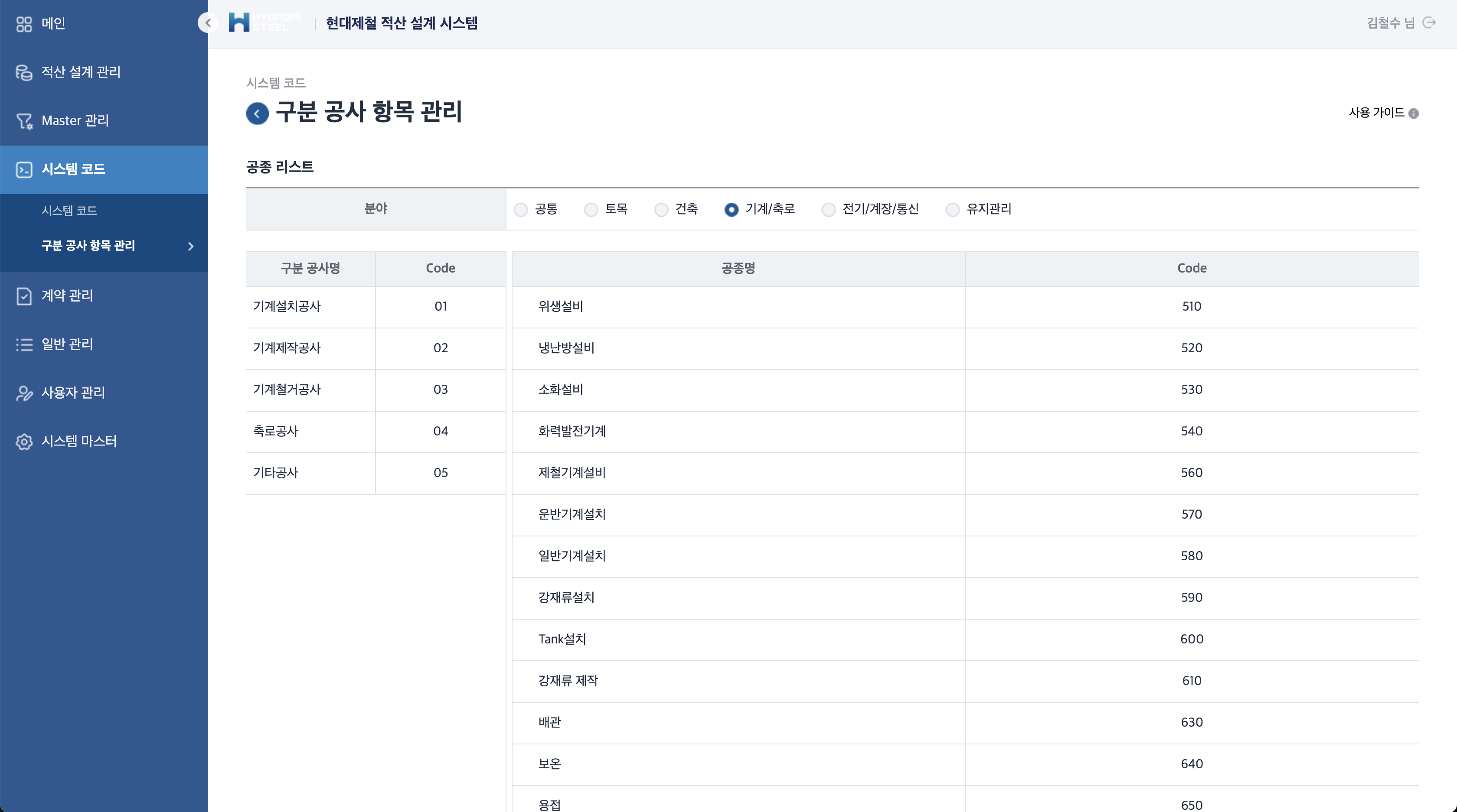 공종(공사 종류)을 분야별로 체계적으로 관리합니다. 공통, 토목, 건축, 기계/축로, 전기/계장/통신, 유지관리 6개 분야로 나누어, 각 분야의 구분 공사명과 세부 공종을 코드 체계로 정의합니다. 기계설치, 제철기계설비, 배관, 보온, 용접 등 제조사 시설공사에 특화된 공종 분류를 지원합니다.