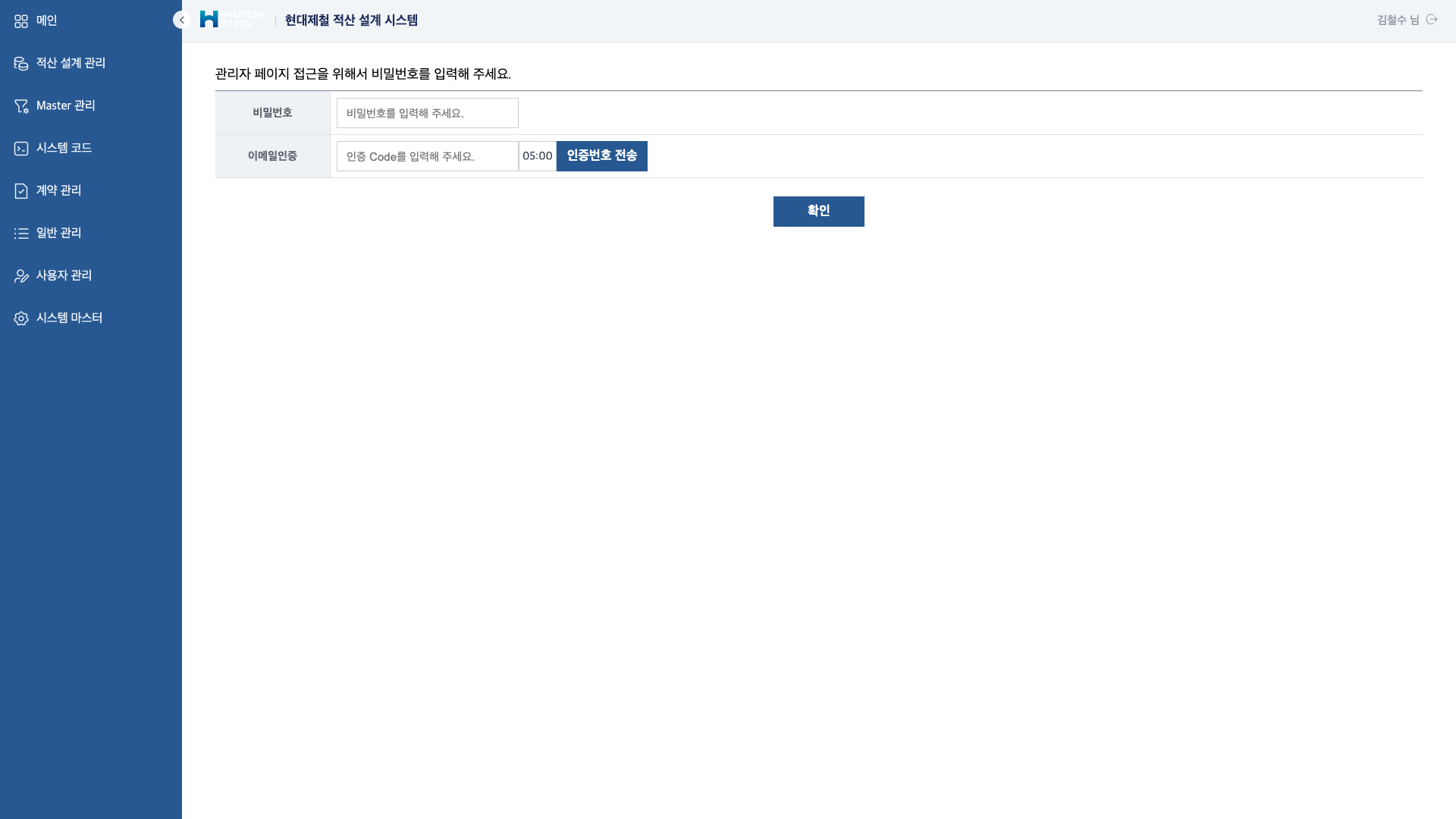 시스템 마스터에서는 공지사항, FAQ, 자료실, 변경 데이터 로그를 관리합니다. 사용자 관리에서는 비밀번호 + 이메일 인증의 2단계 인증을 통해 관리자 접근을 제어하며, 역할(Role) 기반 권한 관리(RBAC)로 세밀한 접근 제어를 구현합니다.